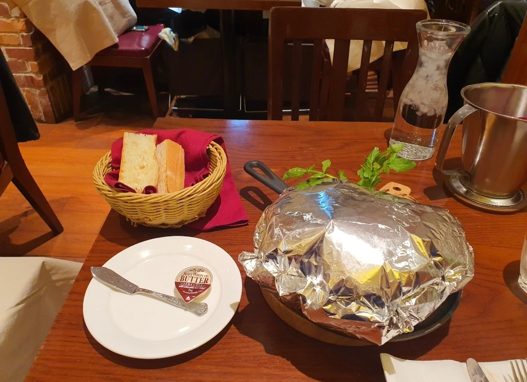 그렇게 입맛을 돋우고 난 후, 스테이크를 먹었는데, 나는 내 식대로 식전 빵에 얹어 먹었다.