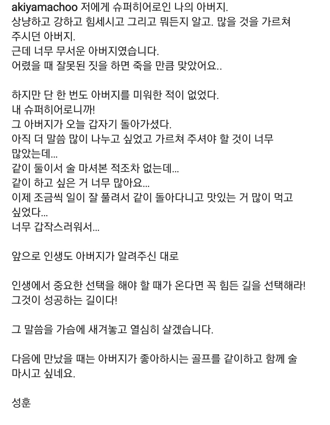 추성훈 선수의 아버지께서 돌아가셨고, 추선수가 아버지에 대한 추모글을 덤덤하게 작성한 것을 보았다.