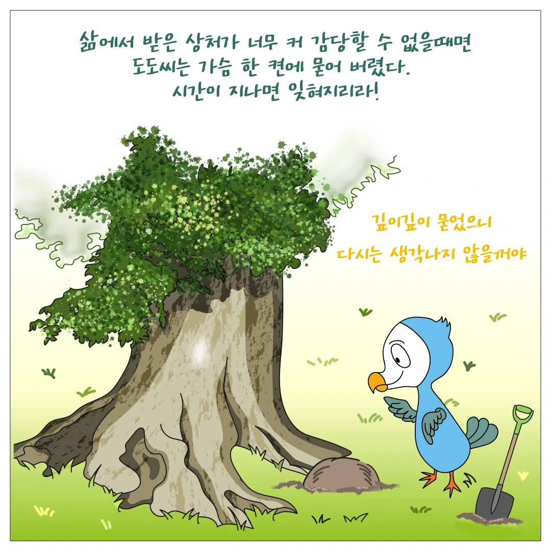 그 당시에는 감당할 수 없는 큰 상처 라면 잠시 마음 한 켠에 묻어두는 것도 힘든 시기를 지나가는 좋은 방법이라고 생각합니다. 하지만 완전히 잊혀지는 상처는 없습니다.