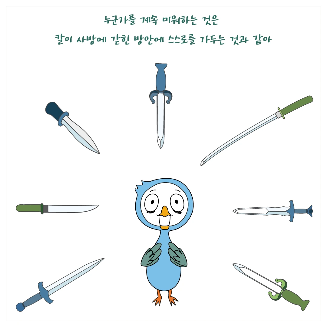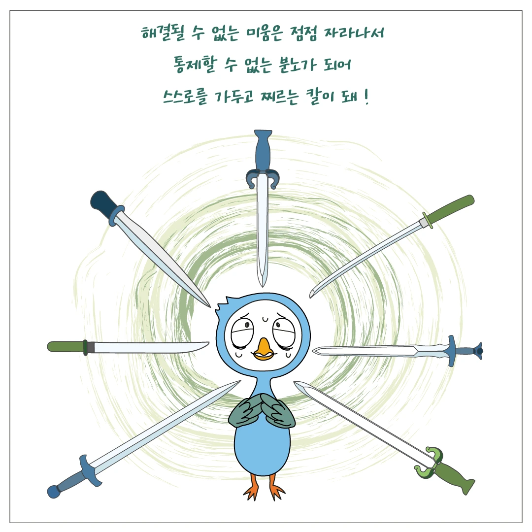 해결되지 않는 미움을 계속 쥐고 살다가 만성 분노와 울분이 쌓이고 화병과 우울증이 오기도 합니다.