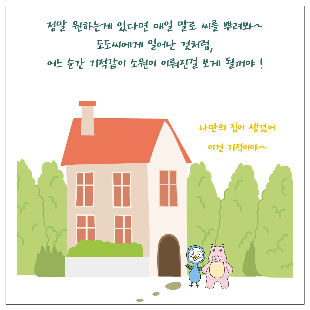 그러다 정말 하늘에서 떨어지듯 제가 소망하던 형태의 집이 좋은 조건에 나타났고, 저도 그 집을 살 수 있는 상황이 되었습니다. 사실 아무 기대도 없이 제가 현실을 이겨내고 힘든 마음을 달래려는 방편으로 매일 상상하며 말했던 것뿐인데, 갑자기 기회가 와서 너무 신기했고 감사했었어요.