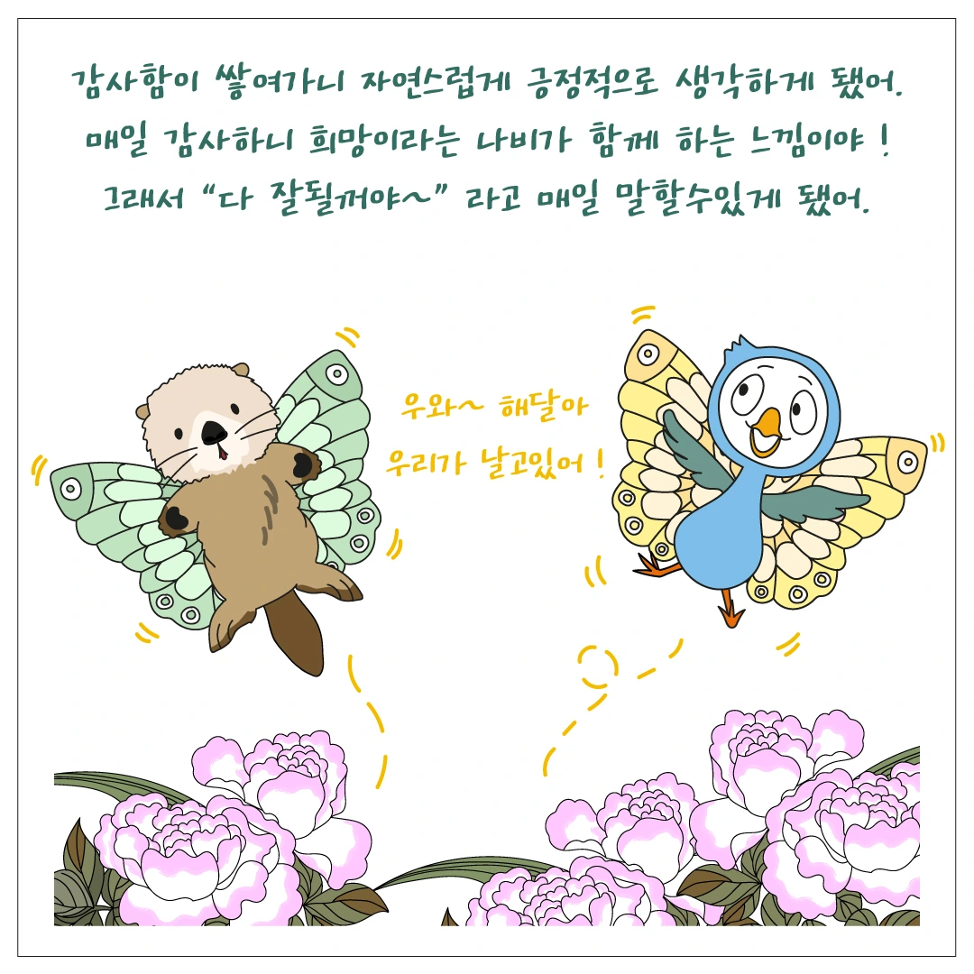 매일 감사한 것들을 찾다 보니 생각보다 제가 운이 좋은 사람이란 생각도 들고, 이런 마음이 쌓이다 보니 어느덧 긍정적으로 생각하는 게 어색하지 않았습니다.