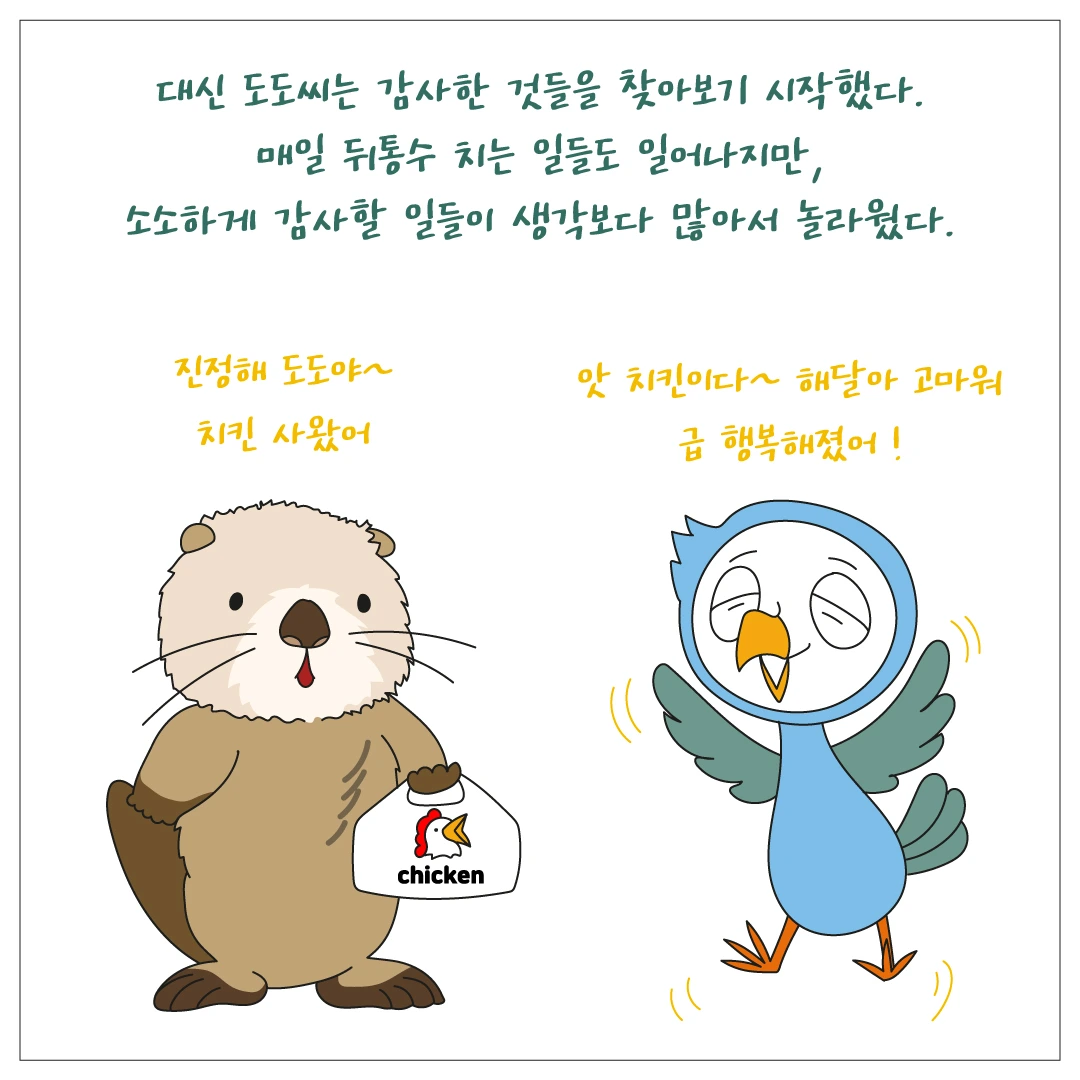 그래서 먼저 매일 조금이라도 감사한 것들을 찾아보기 시작했습니다. 어느 날은 지하철이 제가 오자마자 도착해서 감사했고, 어느 날은 햇볕이 너무 좋아 감사했고, 어느 날은 제가 좋아하는 요리를 먹으며 감사함을 느꼈습니다.