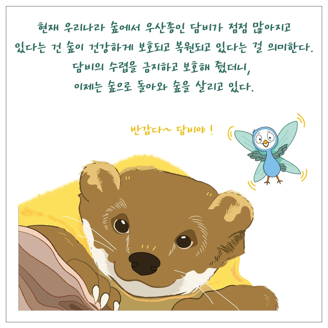 숲이 보호되고 복원될수록 담비는 더 건강하게 살아갈 수 있습니다. 그럼 담비는 숲 생태계를 더 건강하게 만들어주고요.