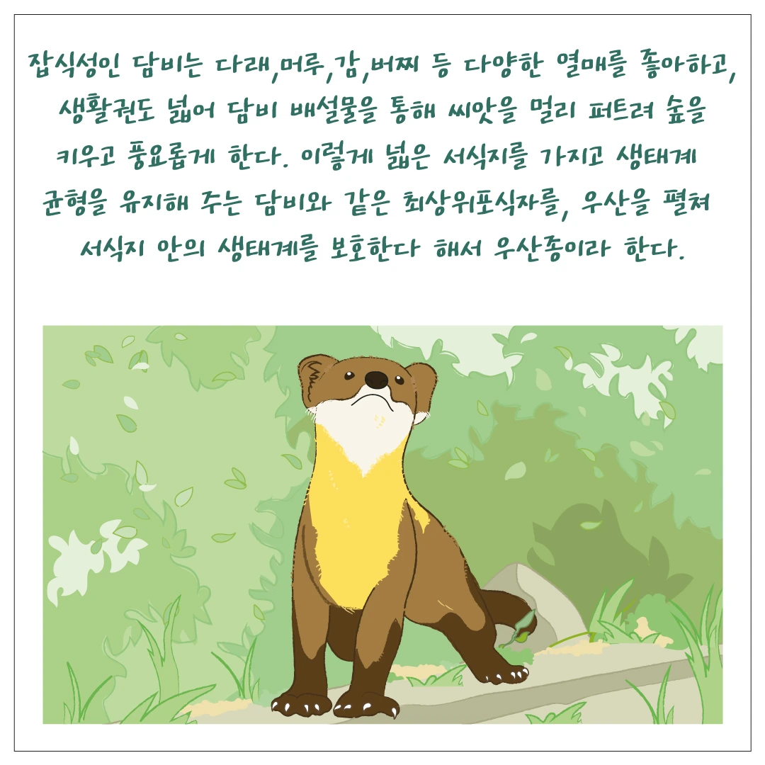 그래서 담비가 살고 있는 지역은 다른 야생동물도 살기가 좋기에, 담비를 보호하게 되면 서식지 안의 다른 동물들도 보호하는 효과가 있다고 합니다.