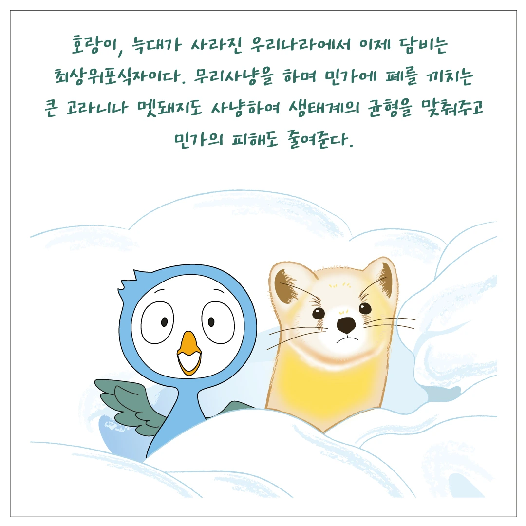 우리나라에서 최상위 포식자였던 호랑이와 늑대가 사라진 후, 최상위 포식자 위치를 차지한 건 자그맣고 귀여운 담비입니다.