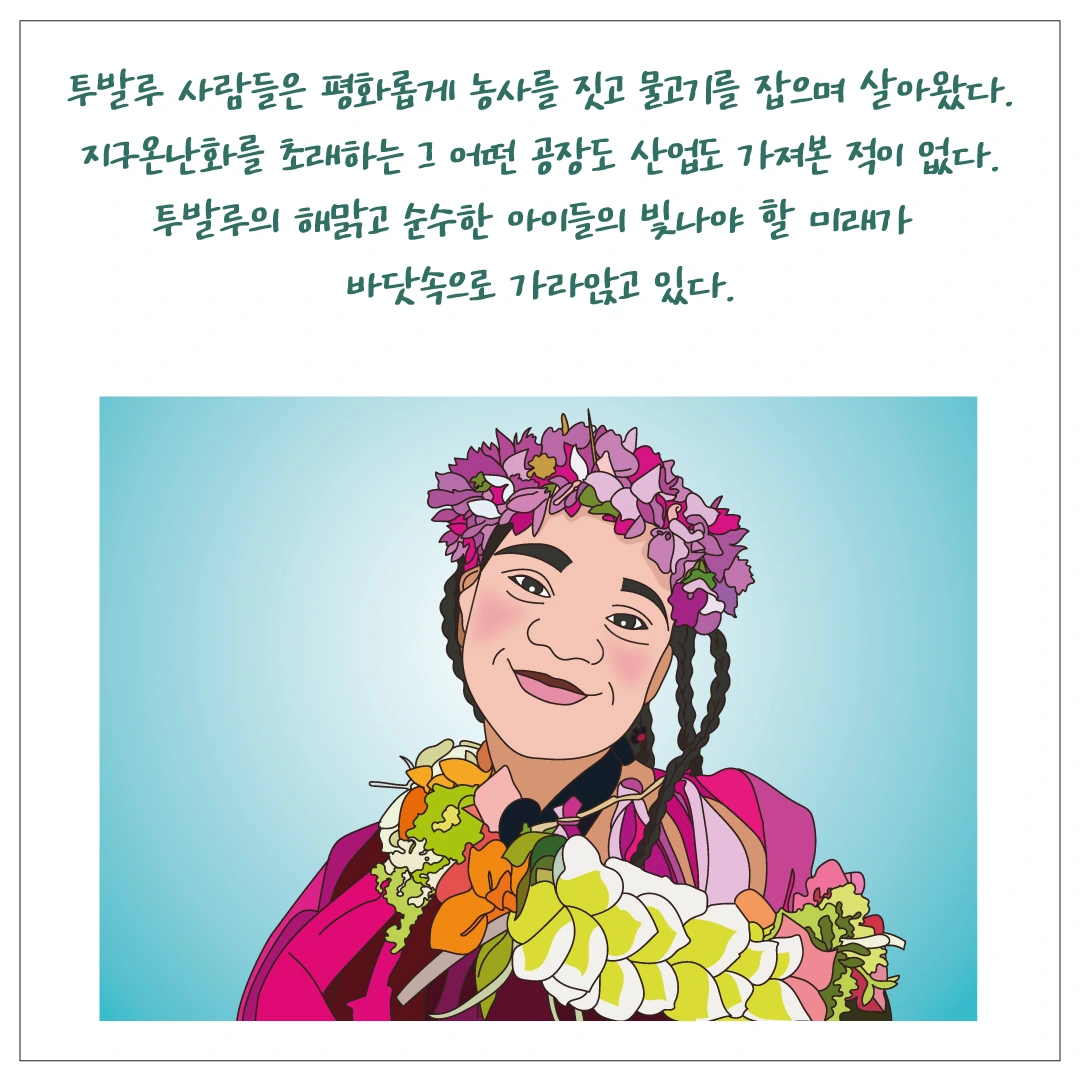 2011년 투발루는 국토 포기 선언을 하고 다른 나라로의 이민을 선포했지만 여전히 투발루 사람들은 섬을 지키며 떠나지 못하고 있어요.