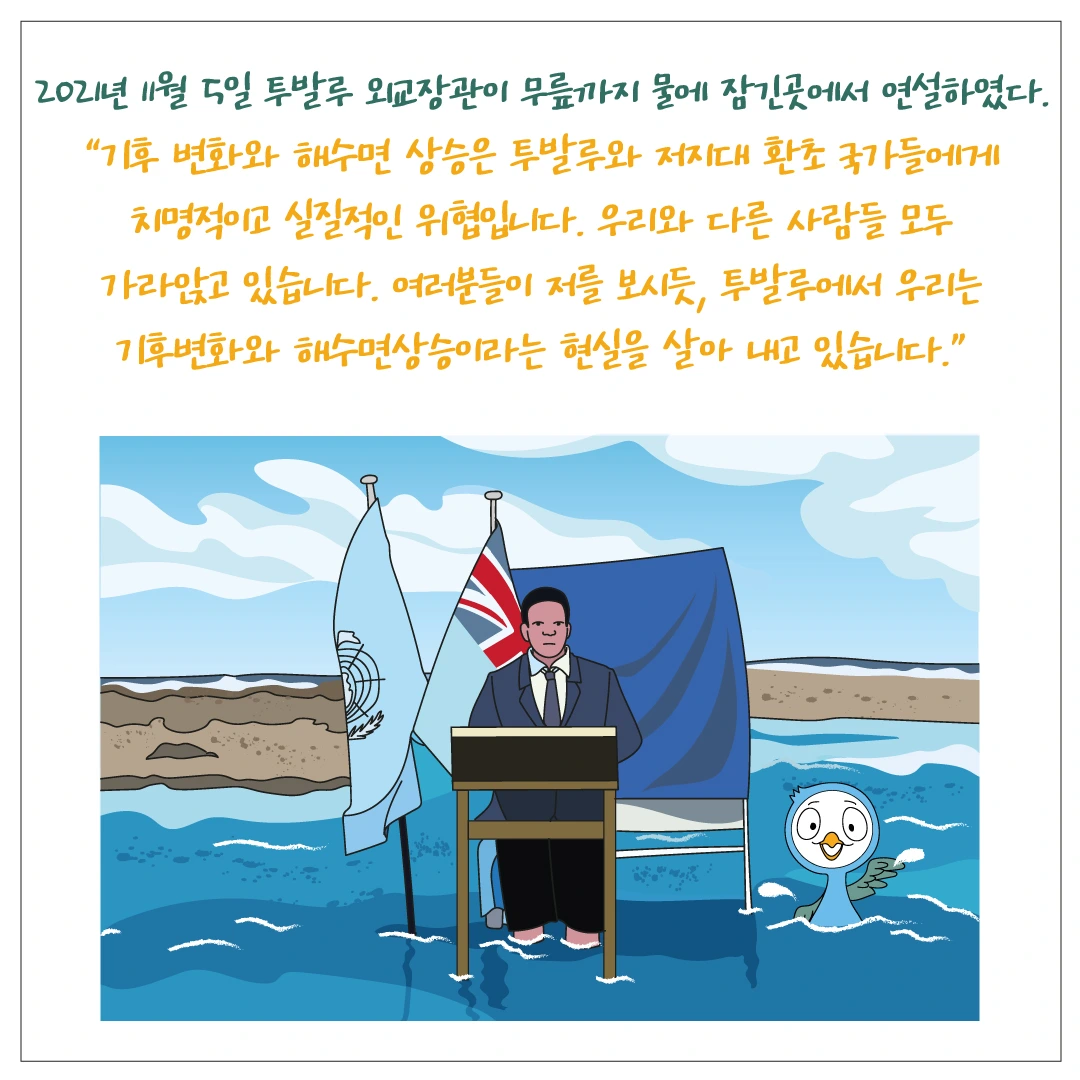 그림 속 투발루 장관이 물속에 서 있던 자리는 예전에는 육지였던 곳입니다.