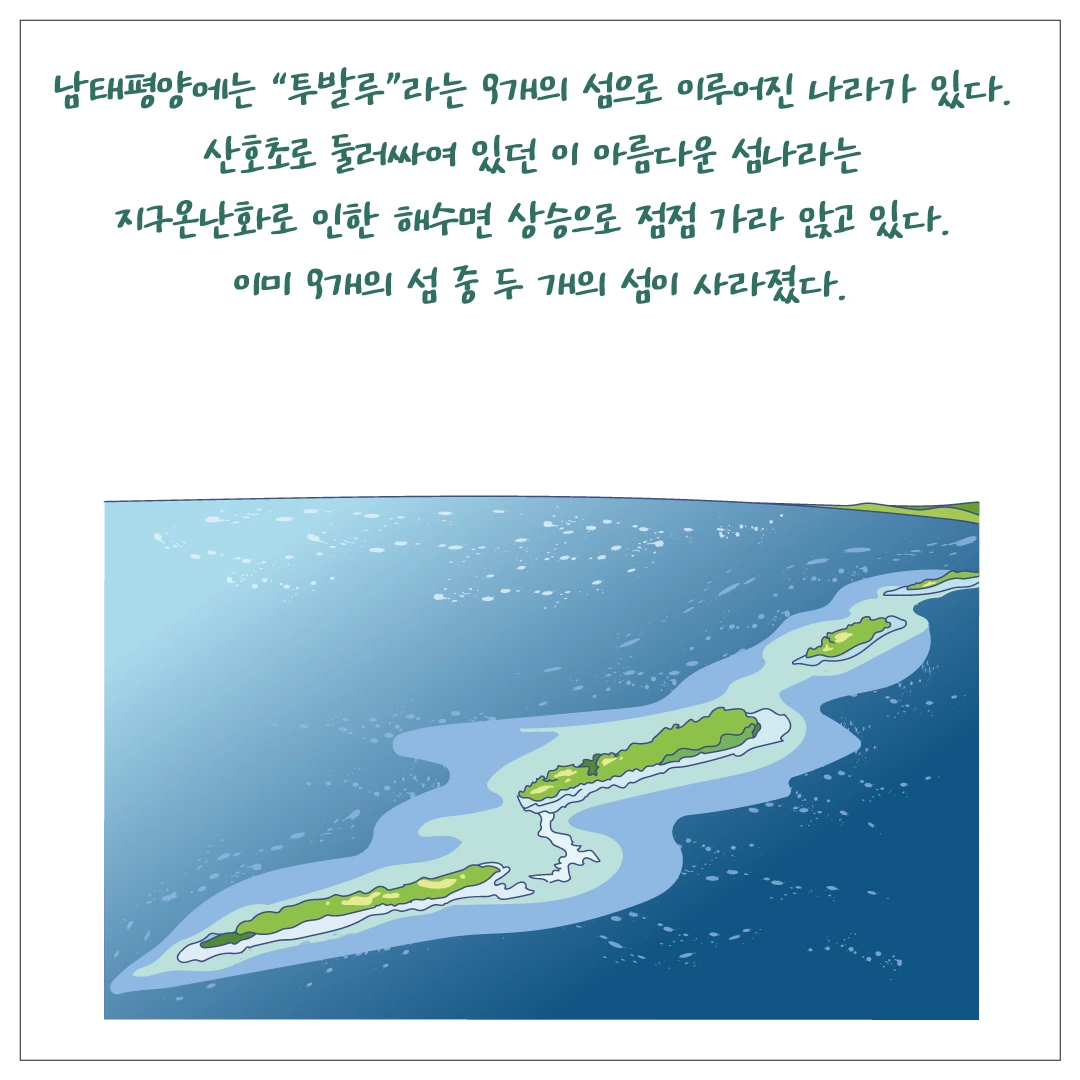 투발루라는 나라를 아시나요? 지구온난화로 인한 해수면 상승으로 가장 먼저 가라앉고 있는 섬나라입니다.