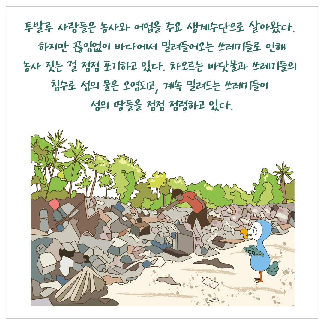 설상가상으로 태평양에서 부유하던 쓰레기들이 밀려와 투발루 사람들은 바닷물에 가라앉아 죽기 전에 쓰레기에 깔려 죽겠다고 합니다.