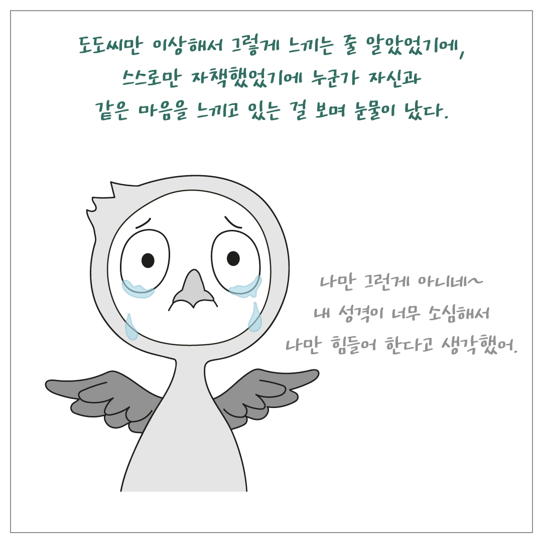 MBTI가 INFP 여서 그랬을 수도 있지만, 사회에서 한 사람 한 사람 대하는 게 너무 힘들고 지치고, 때로는 무례한 이들을 어디까지 참아줘야 하는 건지도 혼란스러웠던 제가 떠올라 눈물이 났습니다.