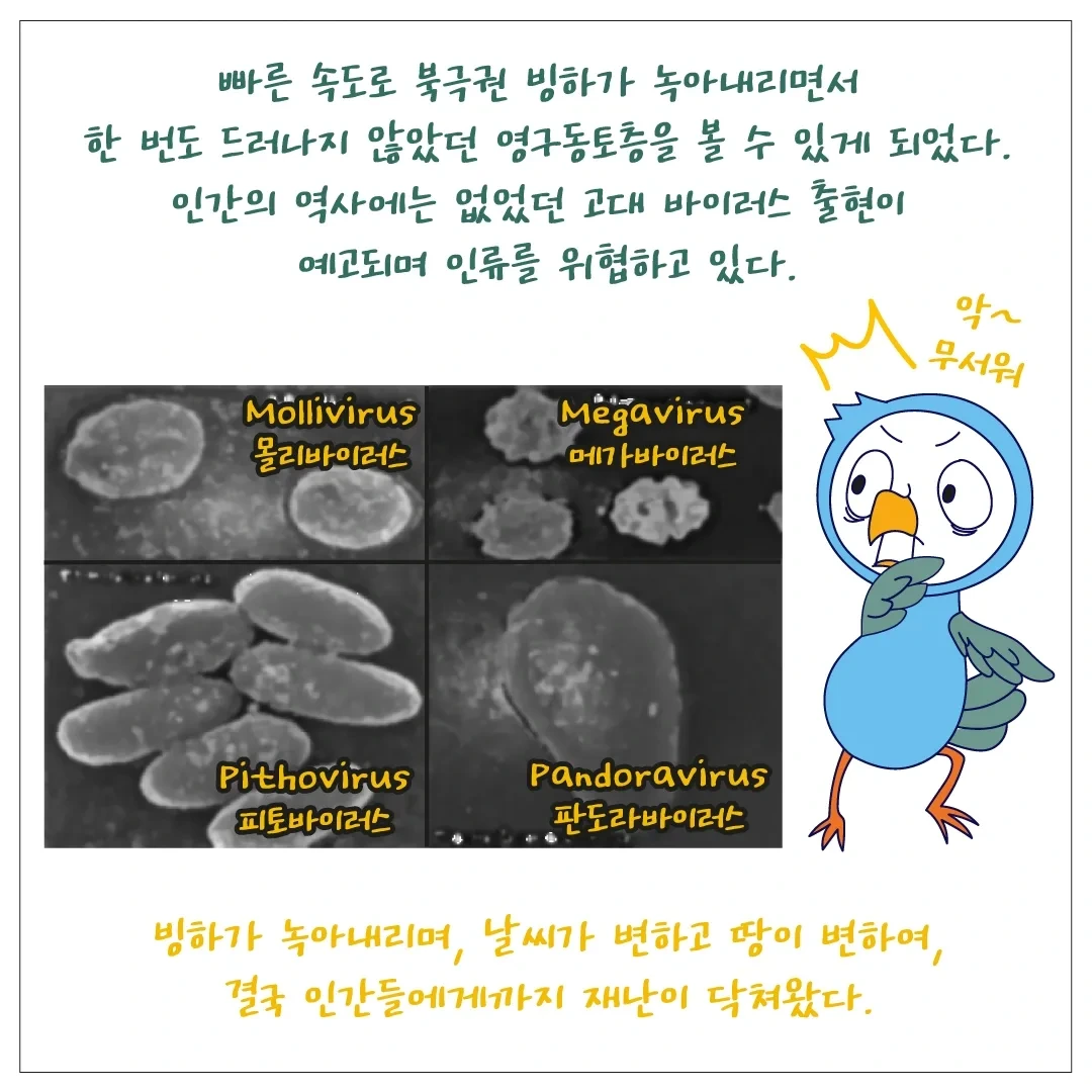 만년빙하가 사라져 드러난 대지에는 아직 인간이 접하지 못했던 미생물이나 고대의 바이러스들이 살아있어요. 이 바이러스들은 빙하에 봉인돼있다가 다시 나타났다 해서 좀비바이러스라 불리기도 합니다.