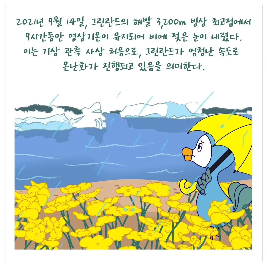 항상 얼어있고 눈만 오던 북극 그린란드 최고점에 비가 내리기도 하고, 알래스카 곳곳은 빙하가 사라져 대지가 모습을 드러내고 있어요.
