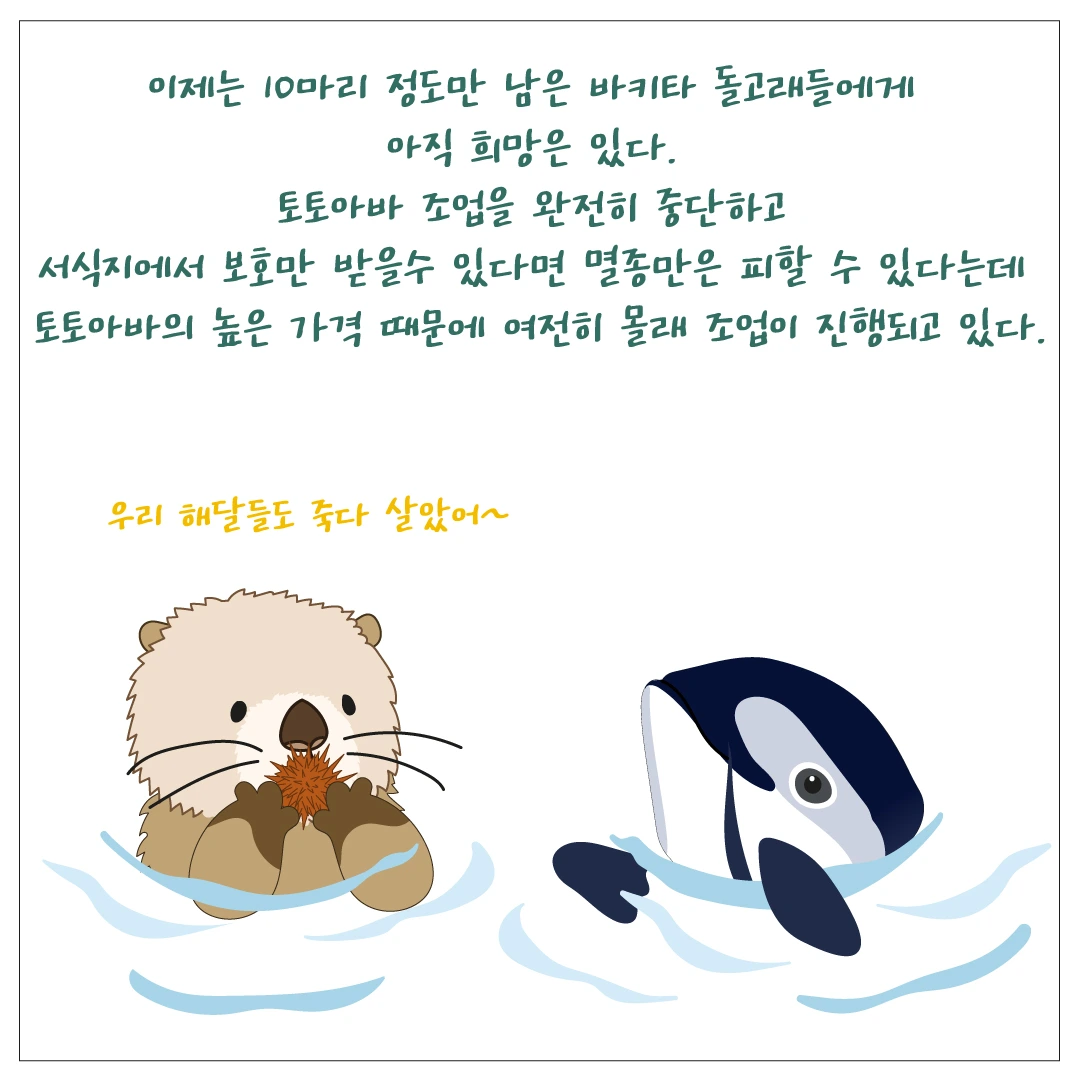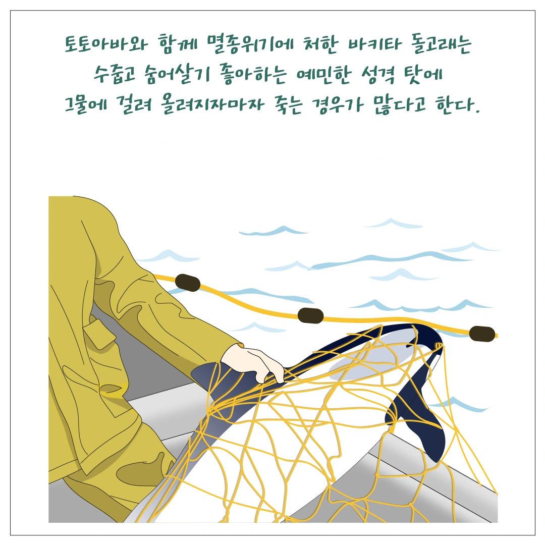 지금이라도 조업을 멈추면 멸종을 막을 수 있다는데, 어부들에게 큰 이익을 주는 토토아바 조업을 멕시코 정부가 적극적으로 막고 있지 않아서 그 수가 계속 줄어들고 있습니다. 8마리만 남았다고 하고 10마리만 남았다고도 하고요