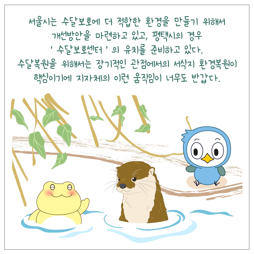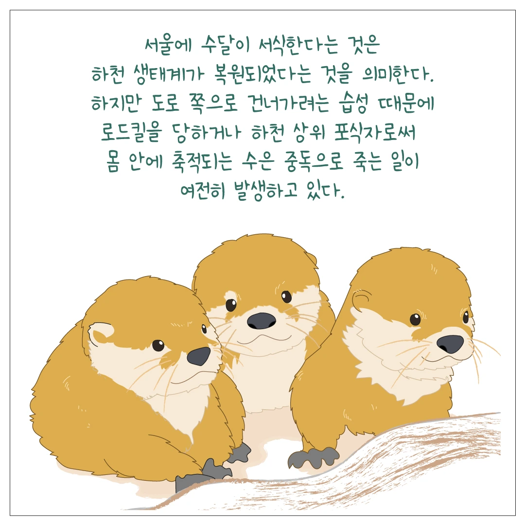 산업화로 하천이 오염되고 메워지며 서식지가 파괴되어 사라졌던 수달들이 돌아왔다는 건 하천 생태계가 복원되어 되살아나고 있다는 걸 의미하니 더욱 기쁘네요.