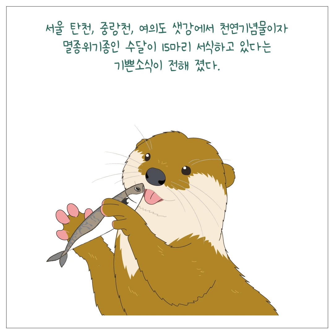 기쁜 소식을 함께 하려 합니다. 천연기념물 330호이자 멸종위기 야생동물 1급인 수달이 서울 하천들에서 15마리가 서식하고 있다네요.