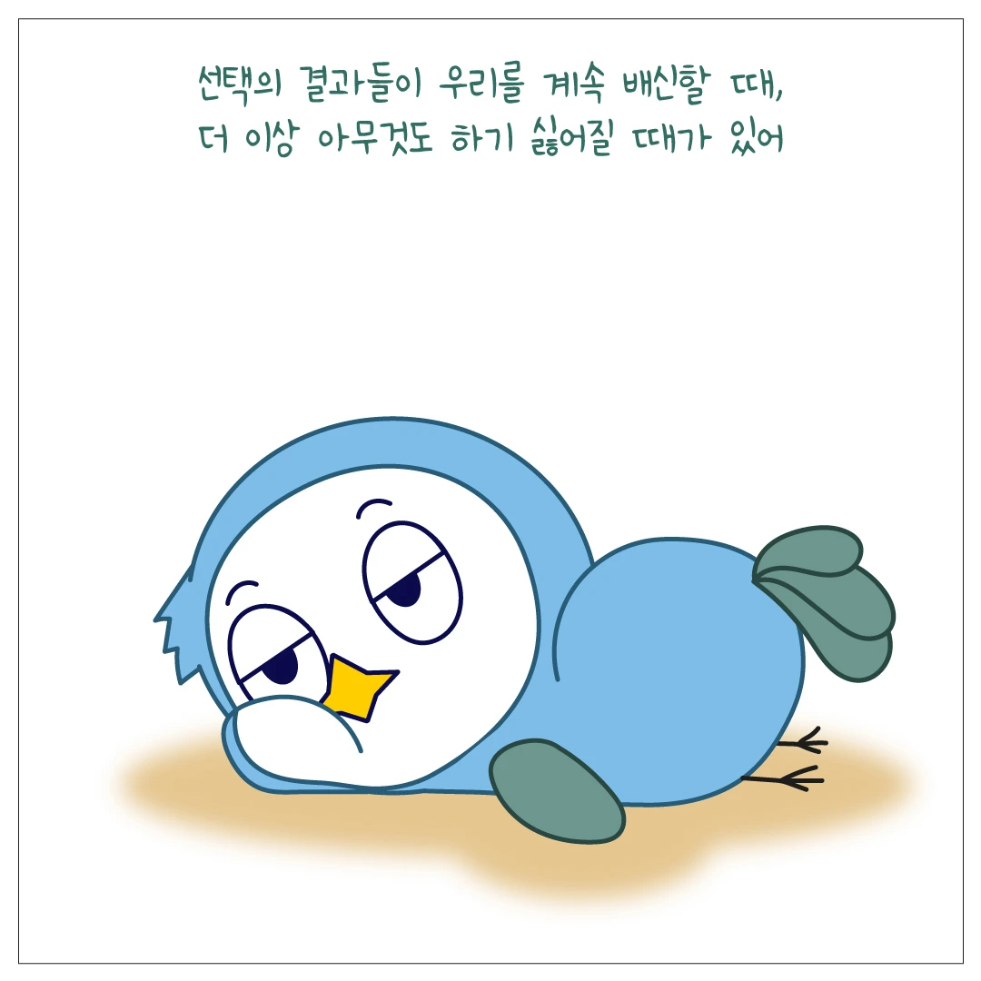 매번 선택의 결과가 좋지 않을 때, 실망이 쌓이고 쌓여서 무기력에 빠져 버립니다. 그리고 이 단계가 길어지면 우울증으로 가는 경우도 있고요.