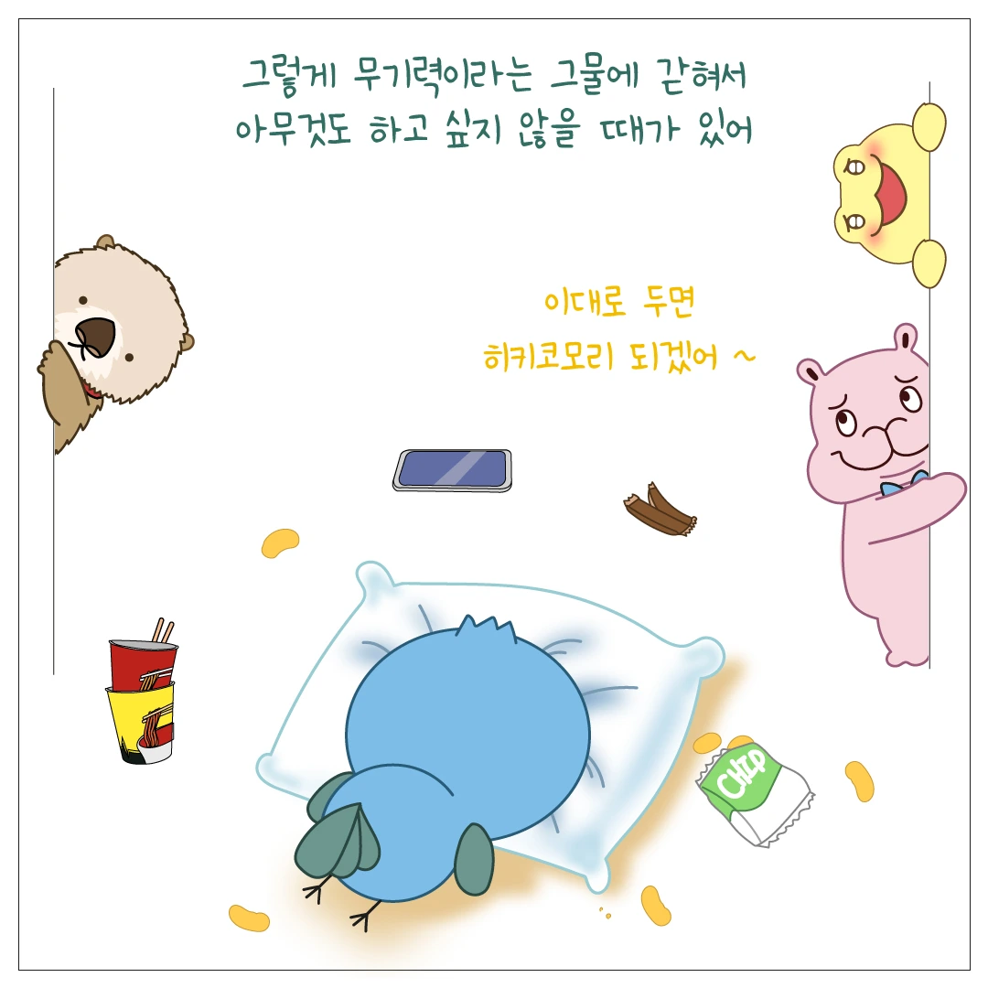 이 그물에 걸리면 머릿속에서는 '계속 이렇게 시간을 흘려보내면 안 돼' '무언가 해야 하는데...' 라는 생각만 머릿속에 가득 차 있을 뿐 몸은 꼼짝도 안 하더라고요. 꼭 나쁜 꿈 속에서 가위눌리는 것처럼 깨어나지 못하는 느낌이었습니다. 저는 특히 예전에 우울증을 경험해서인지 자주 무기력 상태에 빠지곤 합니다