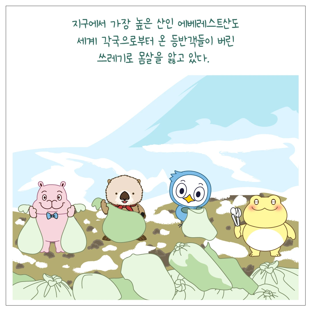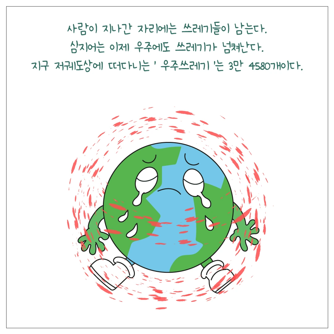 태평양에는 왠만한 나라 크기의 쓰레기가 모여 만들어진 섬이 있고, 우주에는 인공위성이나 우주선에 떨어진 우주쓰레기들이 넘쳐나고, 에베레스트산과 남극마저도 심각하게 오염되고 있습니다.