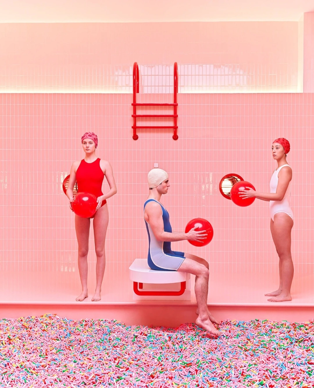 이렇게 각진 자세를 취하도록 기본색 수영복을 입은 모델을 한데 모은 작가는 수천 명의 참가자가 일제히 정해진 자세를 취하도록 주문했.