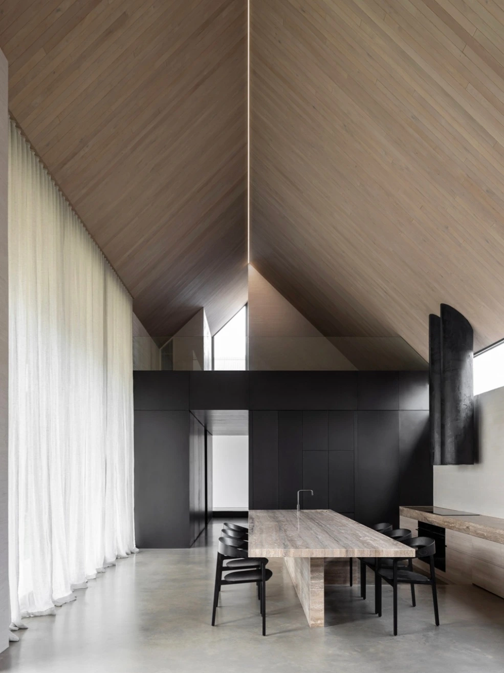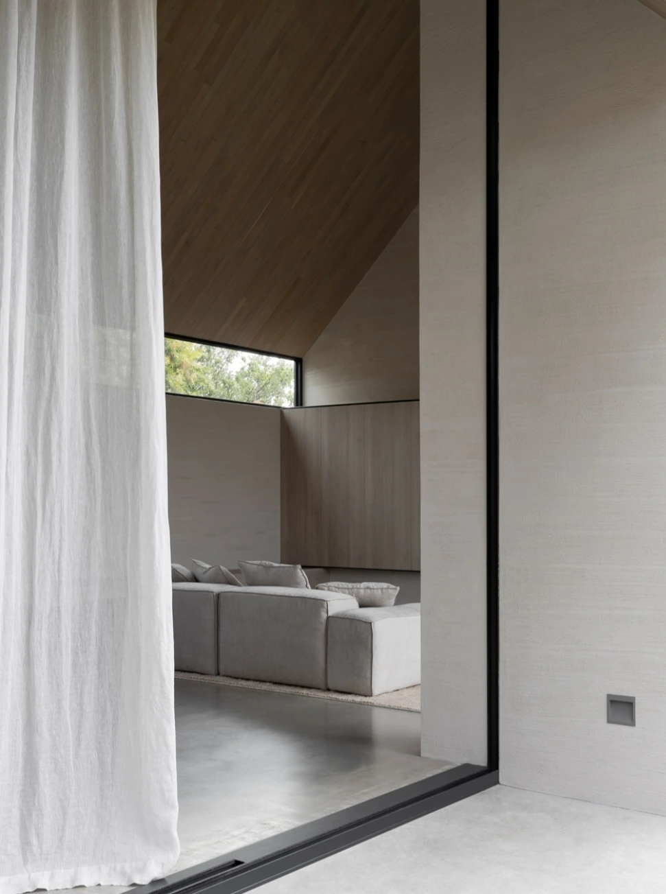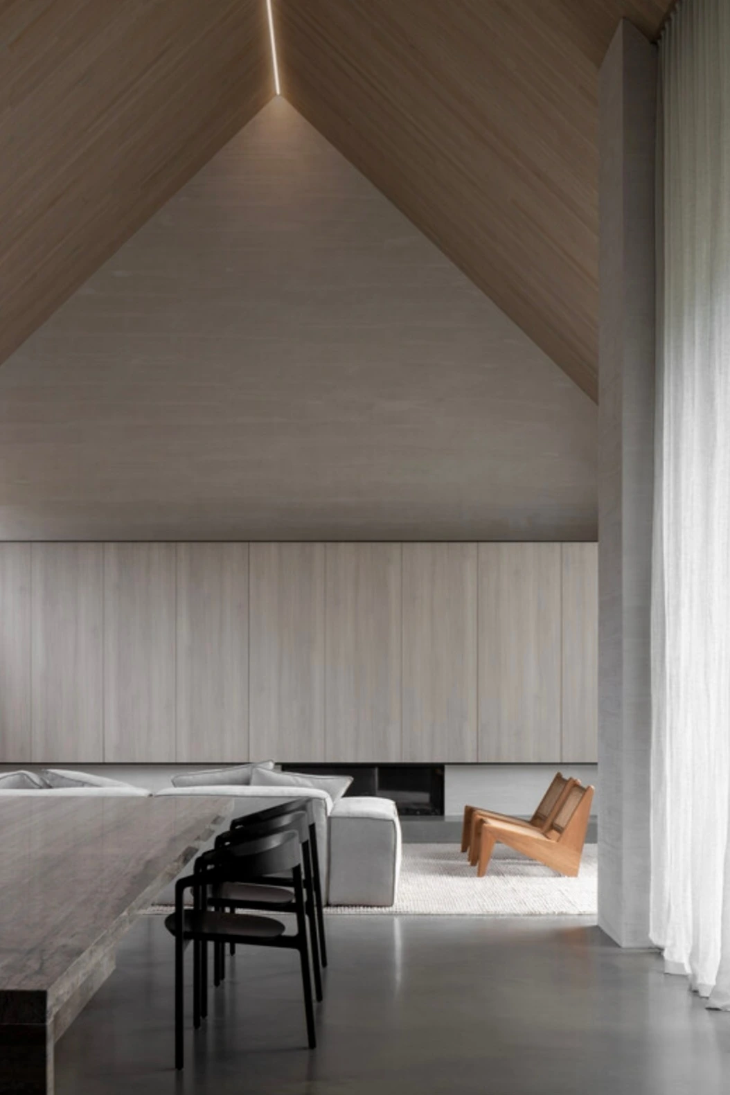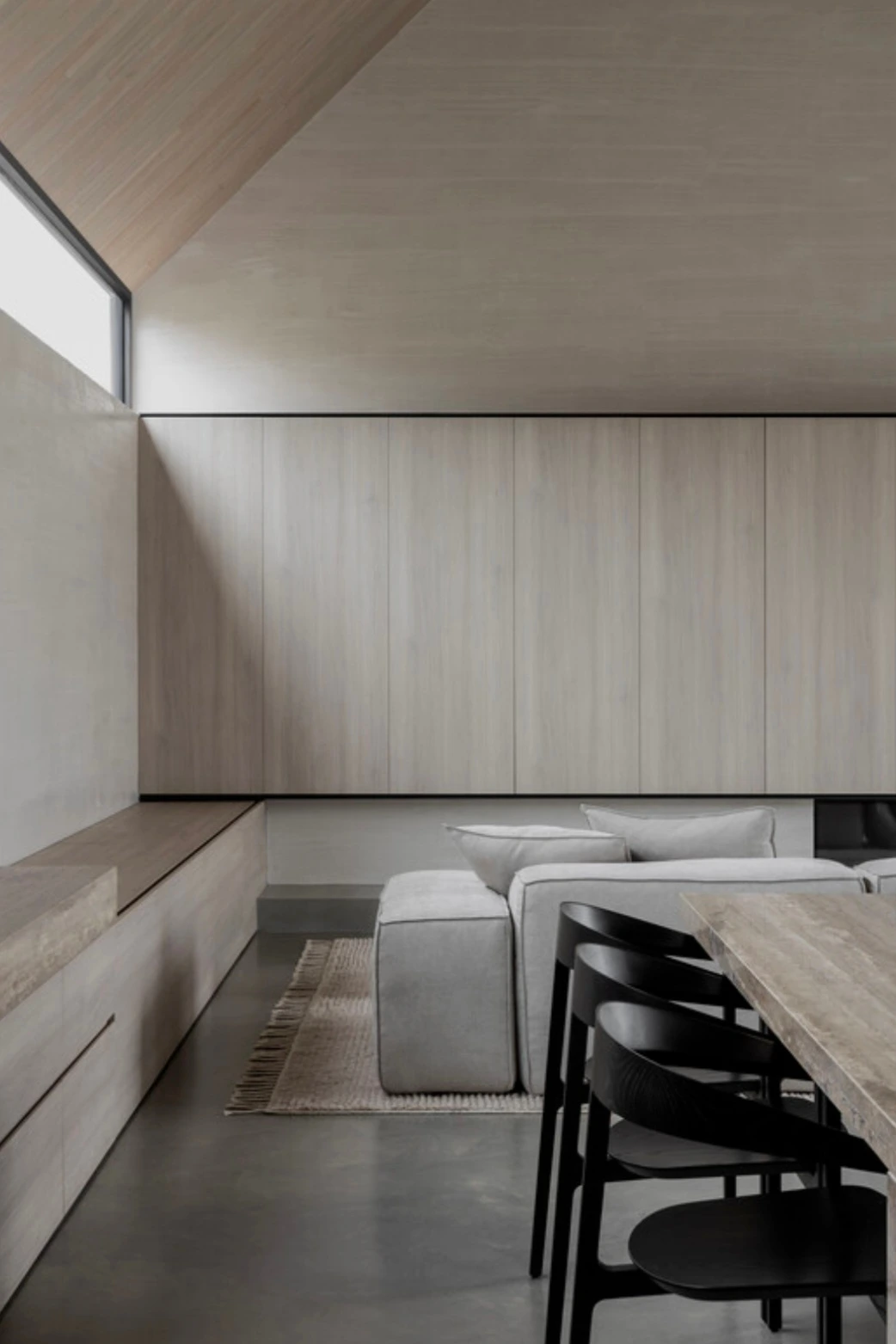 채도가 낮은 목재 천장과 은색 석회화 슬래브, 그리고 윤이 나는 콘크리트 바닥은 부드럽고 따뜻한 색상의 손으로 긁은 듯한 표면을 가진 단단한 석고 벽으로 보완된다.