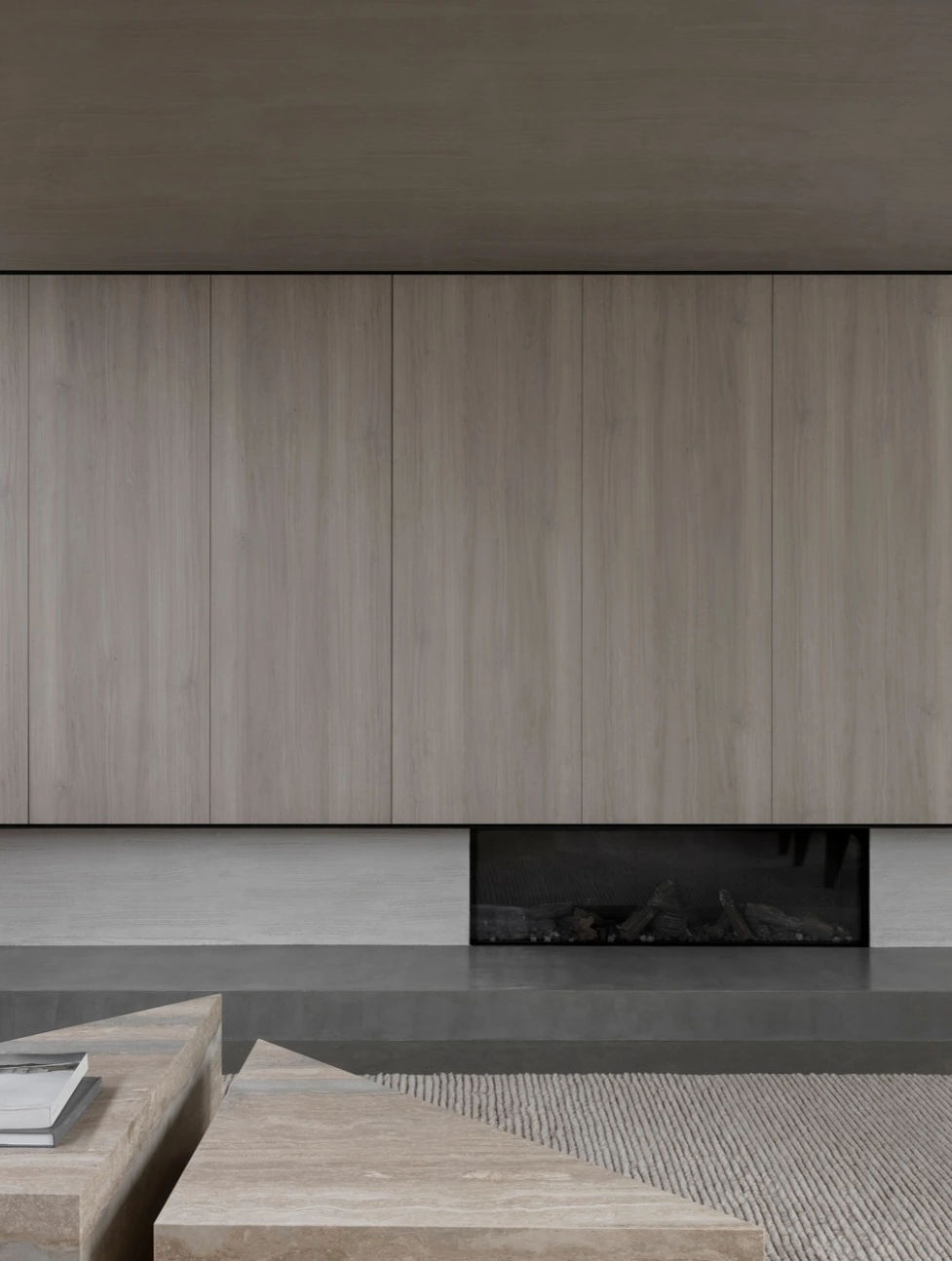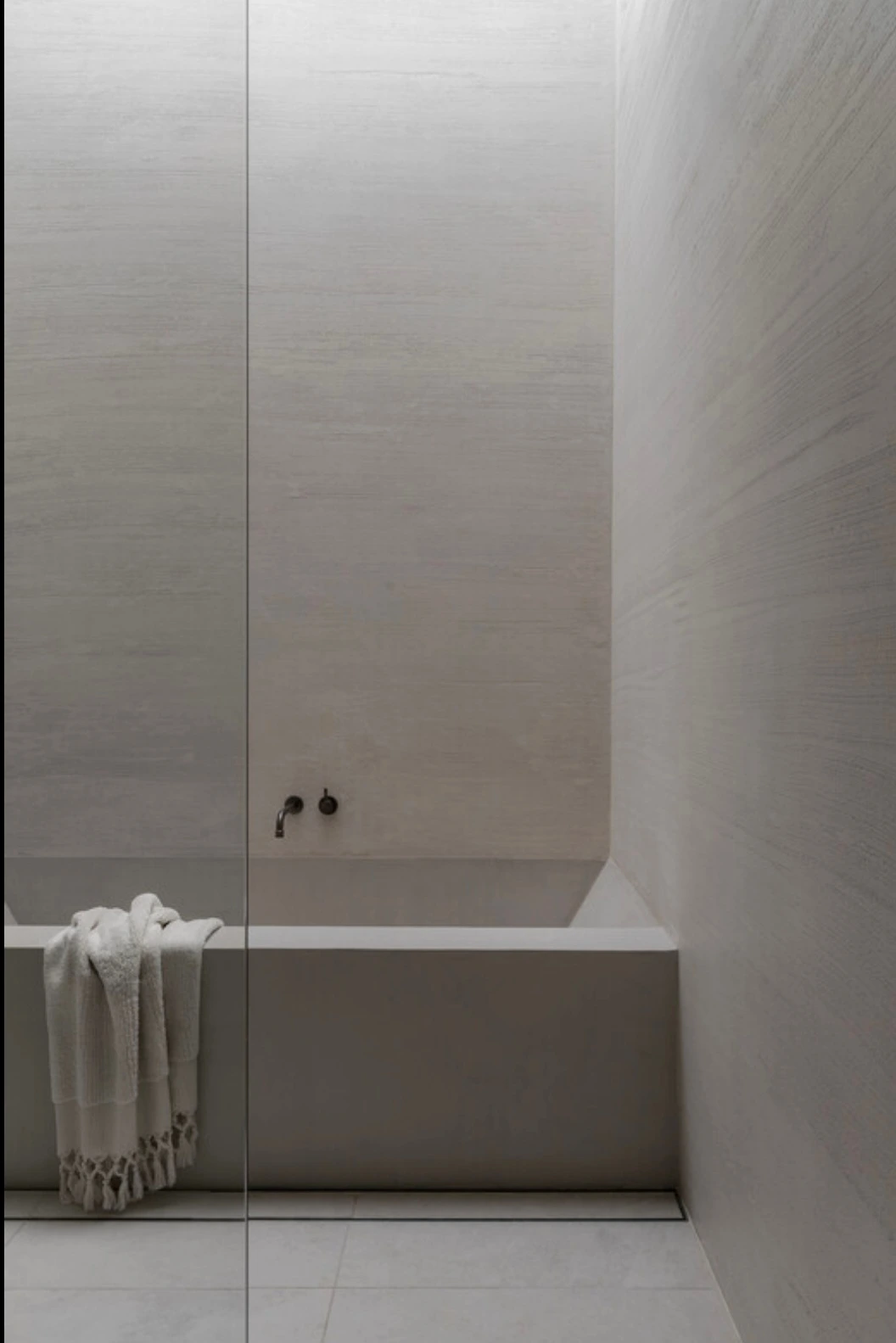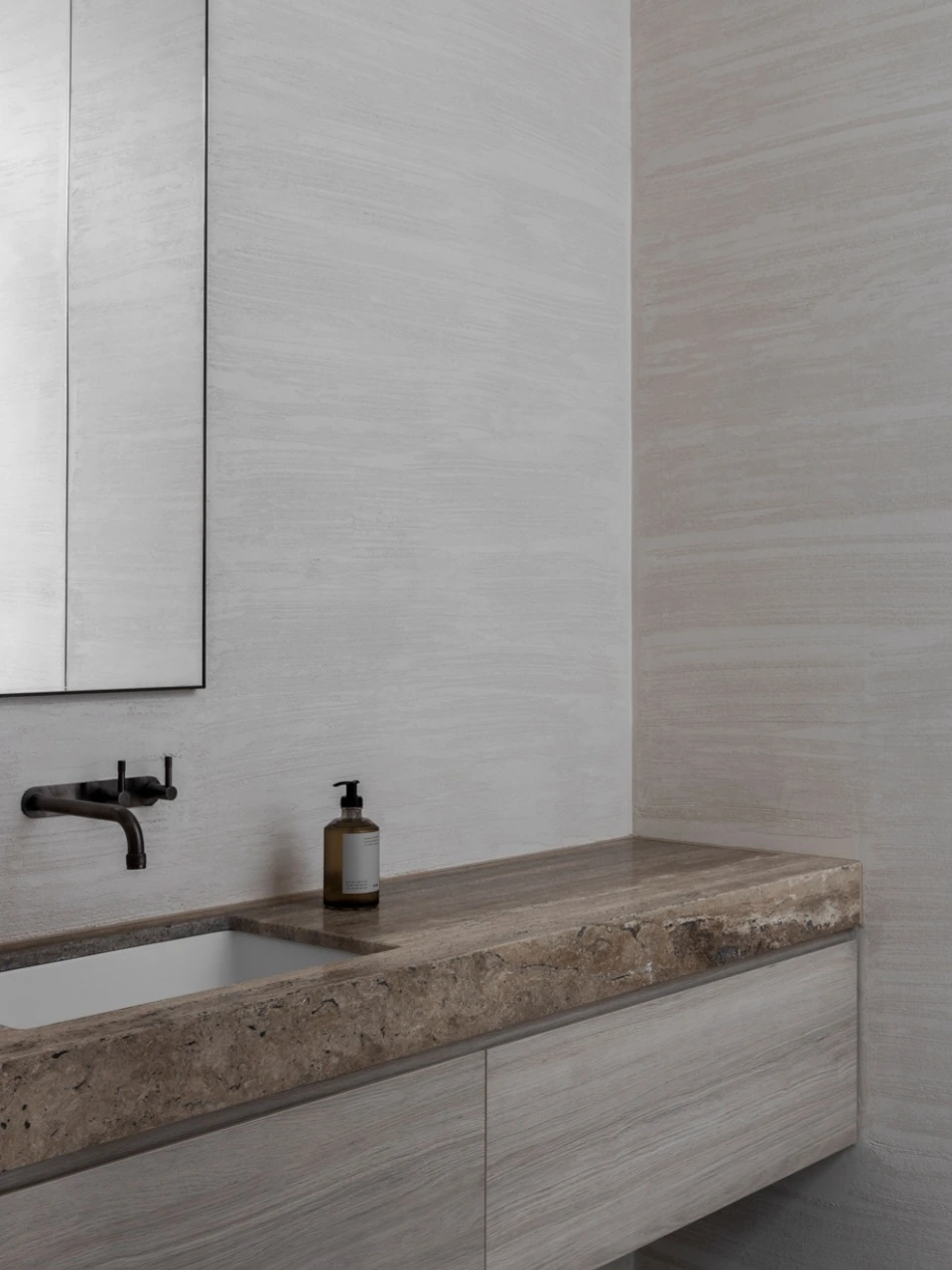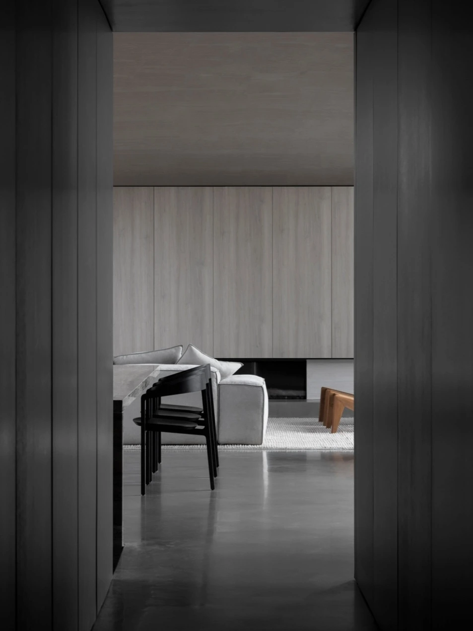 채도가 낮은 목재 천장과 은색 석회화 슬래브, 그리고 윤이 나는 콘크리트 바닥은 부드럽고 따뜻한 색상의 손으로 긁은 듯한 표면을 가진 단단한 석고 벽으로 보완된다.