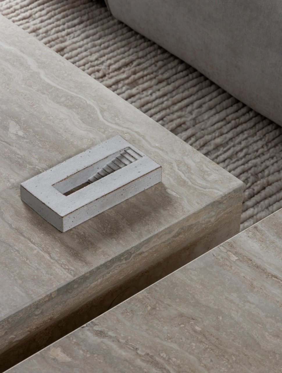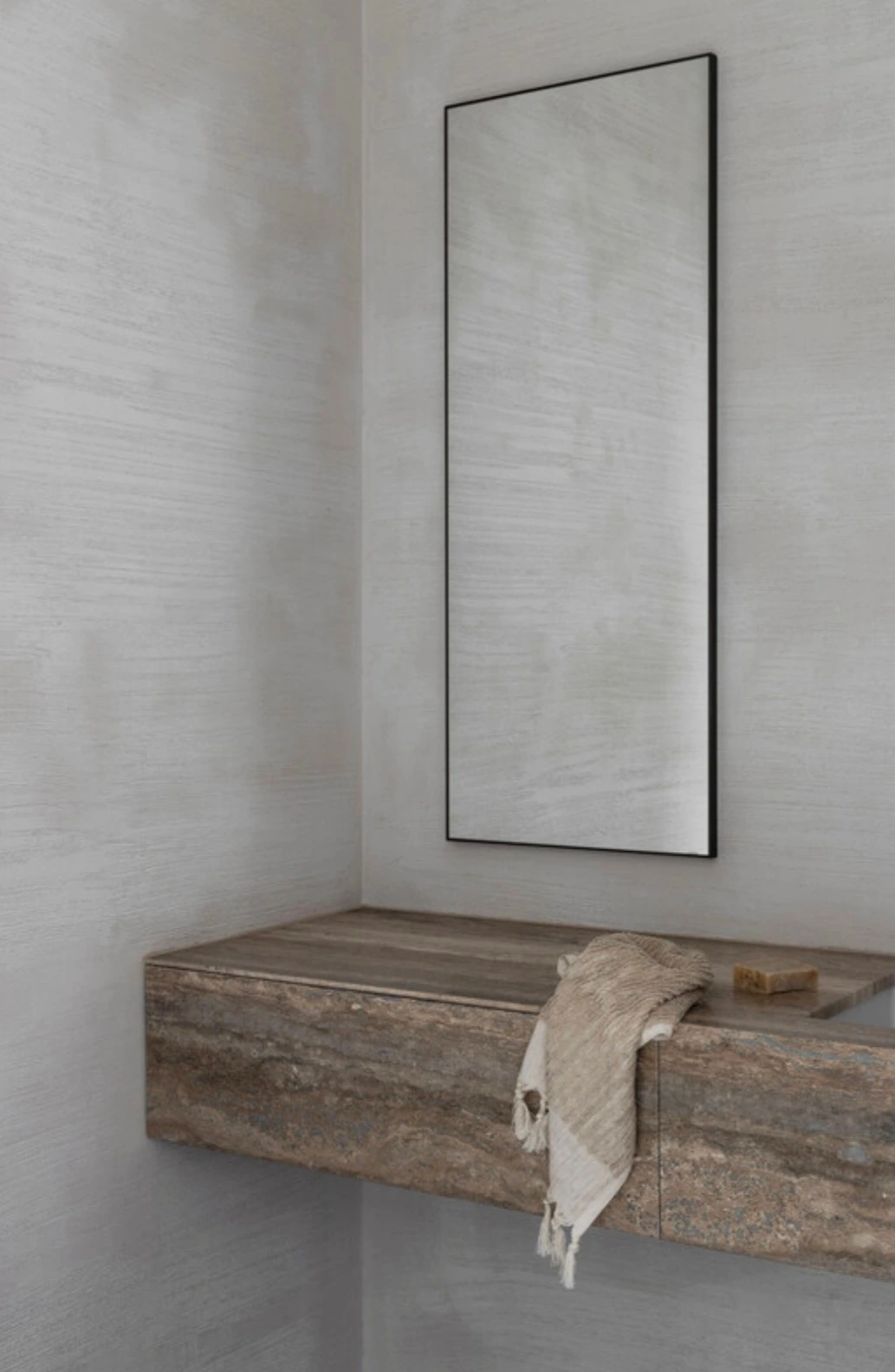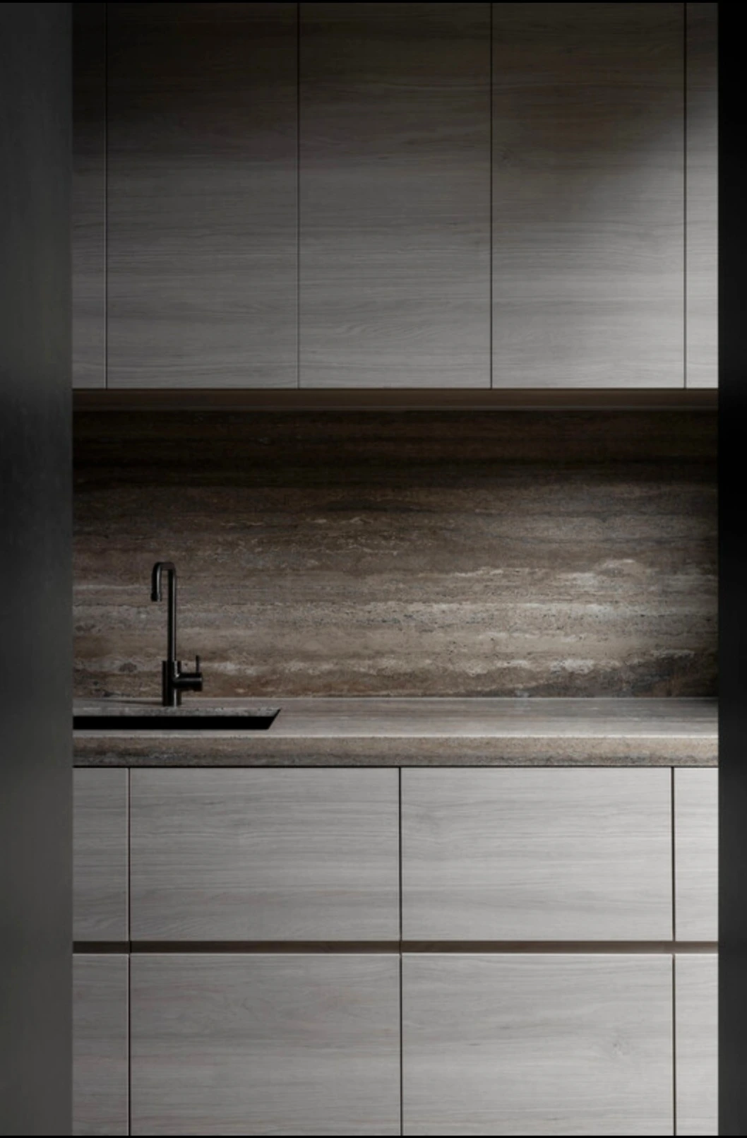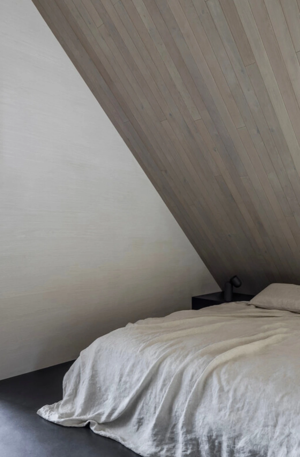 채도가 낮은 목재 천장과 은색 석회화 슬래브, 그리고 윤이 나는 콘크리트 바닥은 부드럽고 따뜻한 색상의 손으로 긁은 듯한 표면을 가진 단단한 석고 벽으로 보완된다.