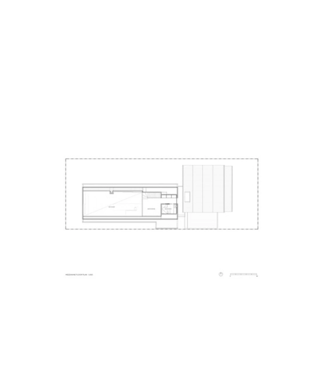 기존 건물에서 증축 건물에 대한 접근은 벽과 천장에 검은색 얼룩덜룩한 가구 패널이 늘어선 밀폐된 복도를 통해 이루어지며. 이곳은 세탁실 및 보관 공간으로 가는 출입구를 숨기는 데에도, 사용된다.