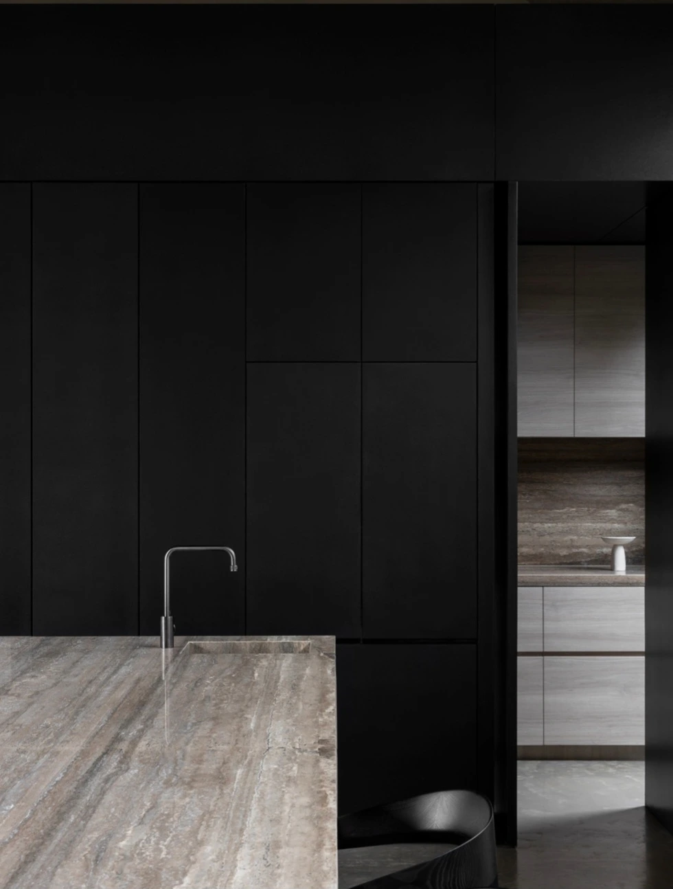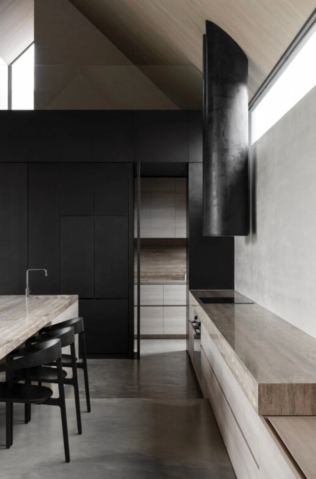 메인 룸에는 대형 아일랜드 벤치가 중앙 무대를 차지하고 아일랜드는 주방 공간 내 별도의 바닥 레벨 변경을 통해 주방 벤치에서 식탁으로 원활하게 변형되도록 설계되었다.