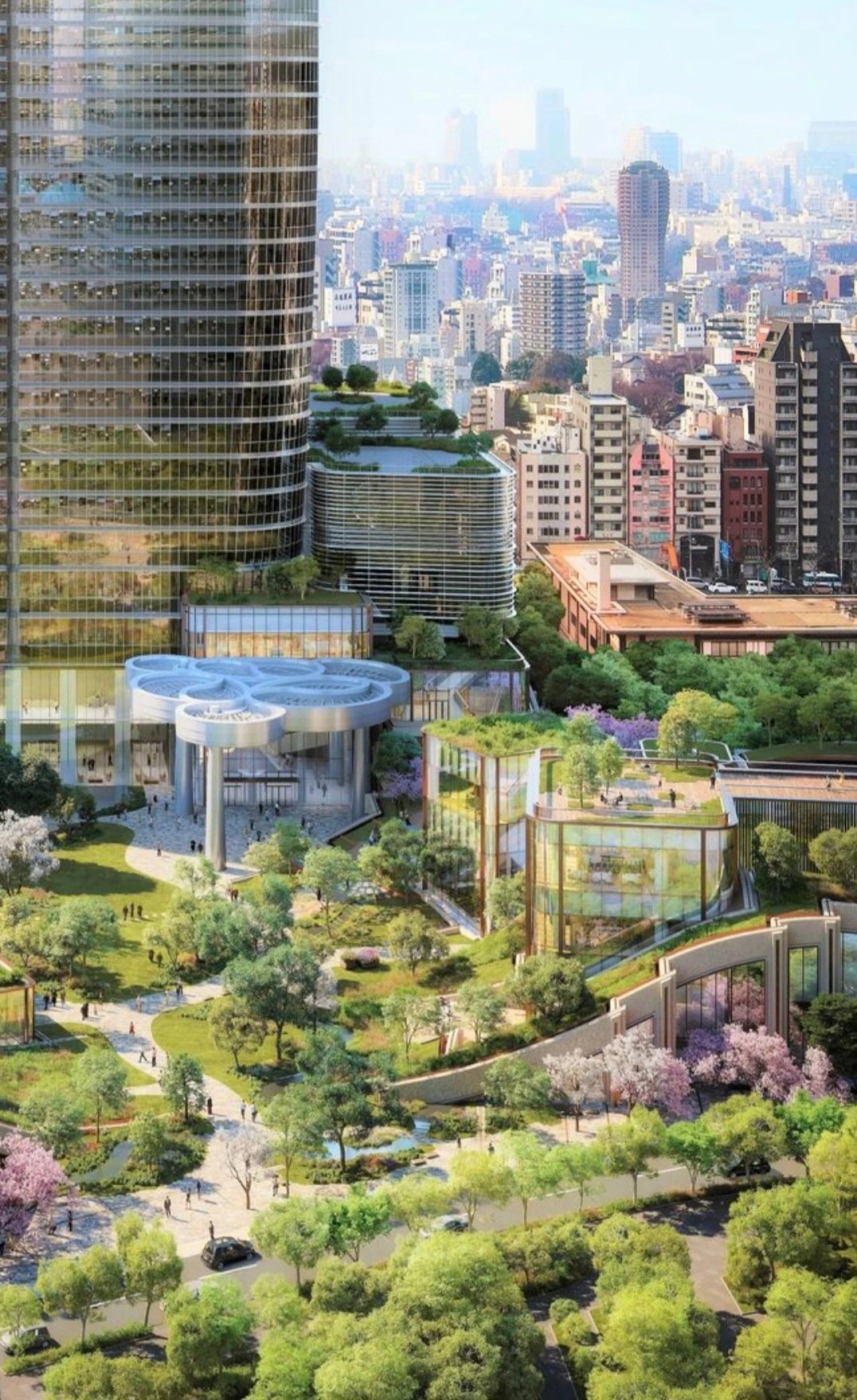 따라서 아자부다이 힐즈도 비슷한 접근 방식을 취했는데 녹지 공간을 전면에 배치한 이 프로젝트는 고층 빌딩의 숲 이상의 것을 만드는 것에 의의를 두며 사람들이 쉽게 모일 수 있는 장소로 만들기 위해 녹색 광장을 만들었고 그것을 이 프로젝트의 메인테마로 사용했다.
