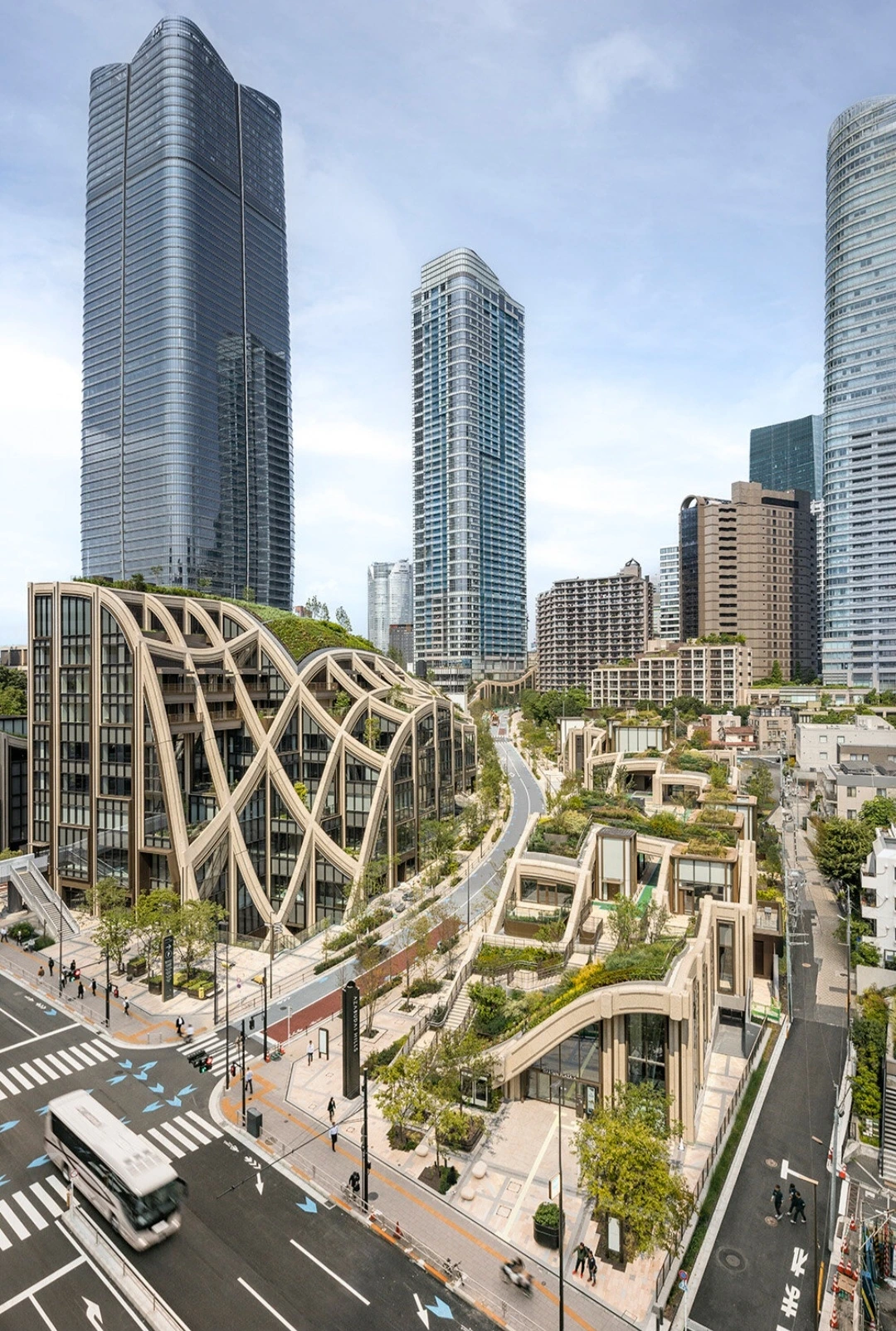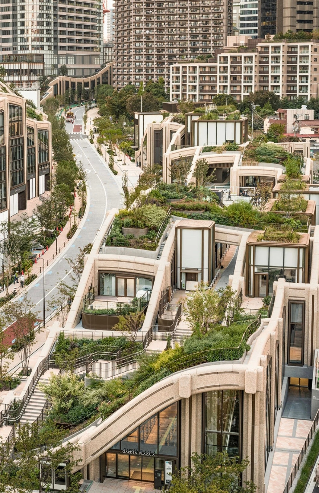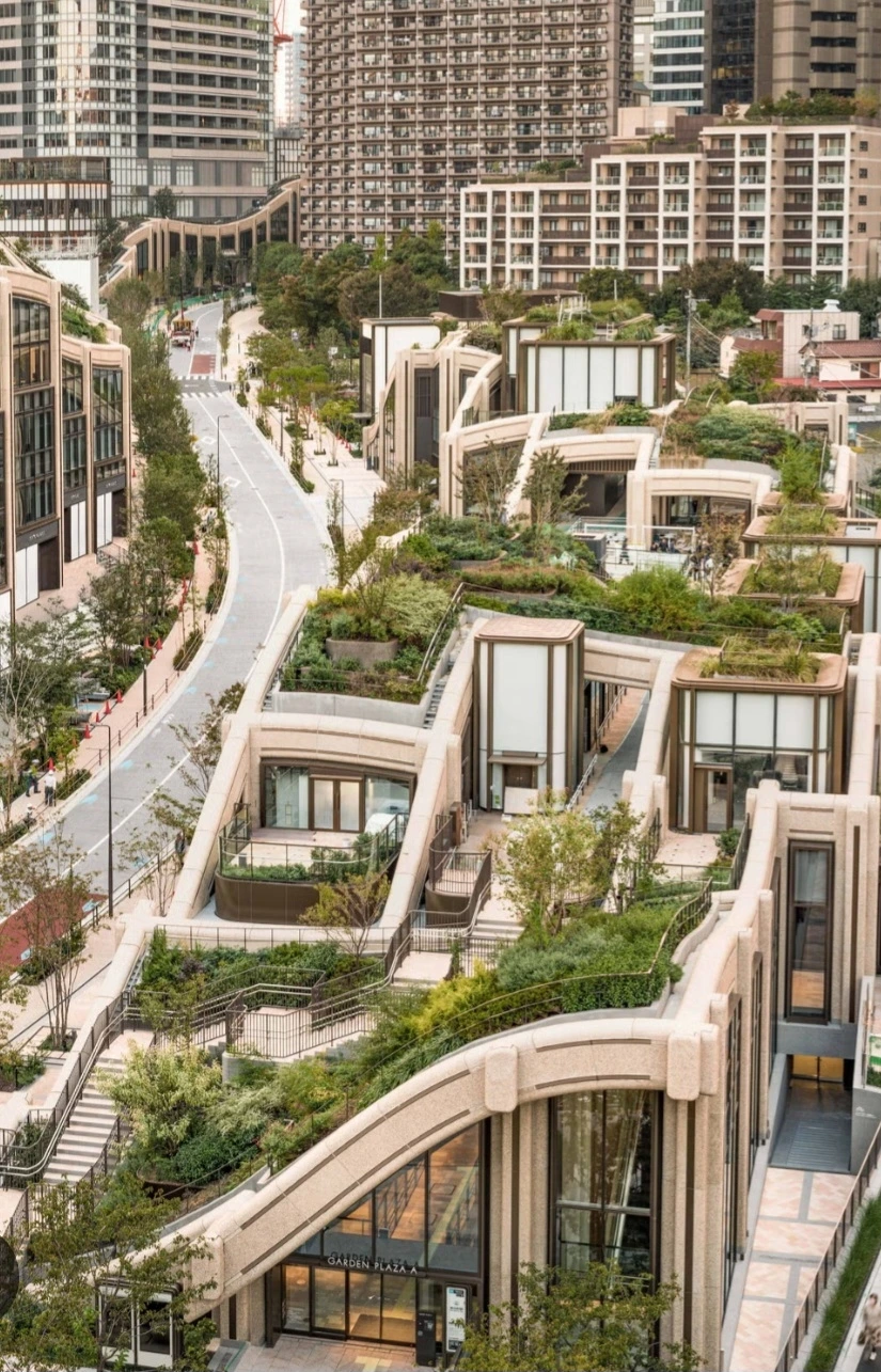 이를 위해 아자부다이 힐즈의 저층 건물인 가든 플라자Azabudai Hills Garden Plaza는 Thomas Heatherwick 토마스 헤더윅이 디자인한 유기적 형태를 특징으로 하며, 이 지역의 언덕처럼 물결치듯 굽이쳐 흐르는 모습으로 디자인되었다.