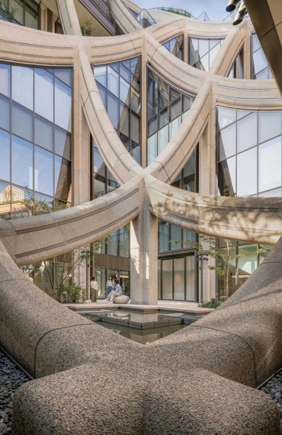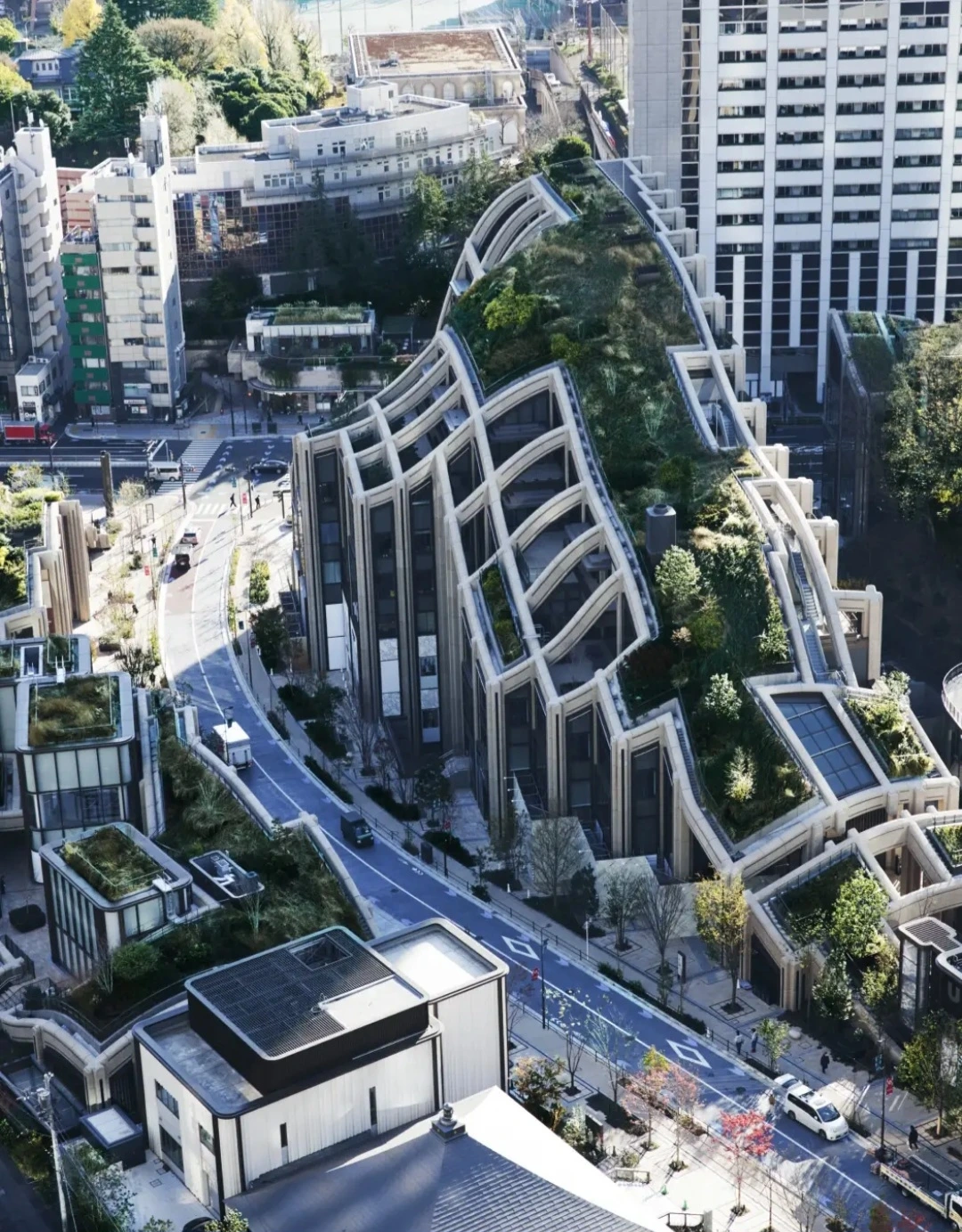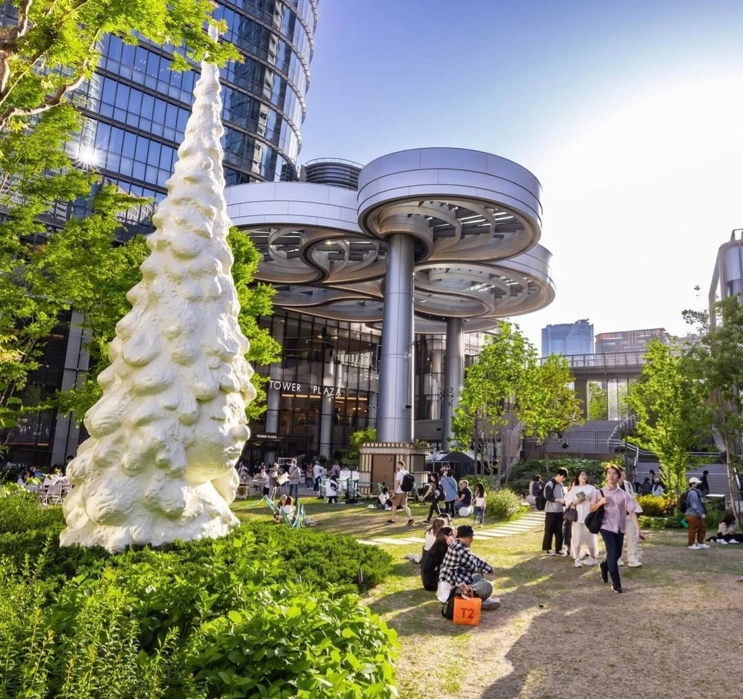 이를 위해 아자부다이 힐즈의 저층 건물인 가든 플라자Azabudai Hills Garden Plaza는 Thomas Heatherwick 토마스 헤더윅이 디자인한 유기적 형태를 특징으로 하며, 이 지역의 언덕처럼 물결치듯 굽이쳐 흐르는 모습으로 디자인되었다.