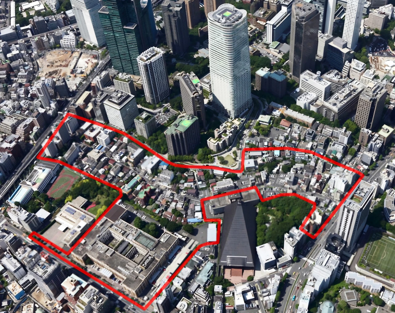부지는 Y자 모양으로, 불규칙한 세 구역으로 나뉘며, 가장 좁은 지점의 너비는 30m에 불과한 오래된 도심인 아자부다이 지역은 구불구불한 지형에 언덕과 계곡으로 나뉘어있었는데 이 단편화된 구역에는 작고 오래된 목조 주택과 건물이 들어서 있었고, 그중 많은 건물이 노후화되어 있었다.