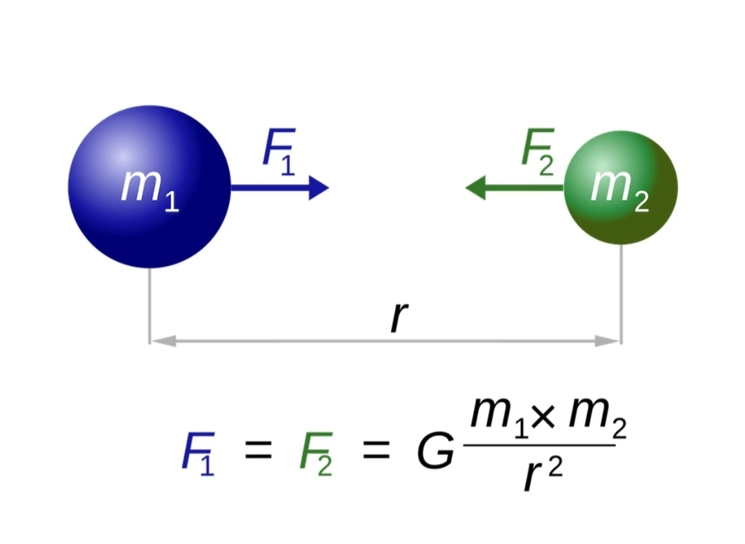 만유 인력의 법칙에 따르면 두 물체 사이의 인력(F)은 질량(m1및 m2)의 곱에 정비례하고 거리 r의 제곱에 반비례한다 (역제곱 법칙). 그들 사이에 비례 상수 G는 중력상수이다