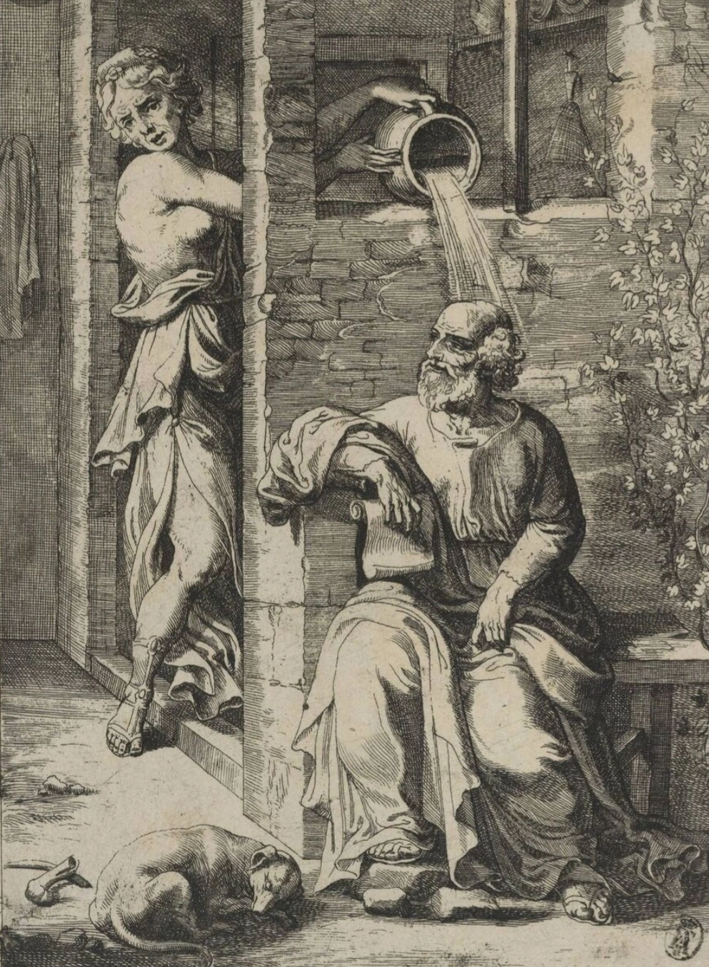 '소크라테스의 머리에 오줌병을 붓고 있는 그의 아내 Xanthippe' Image credit: conchapman.wordpress.com