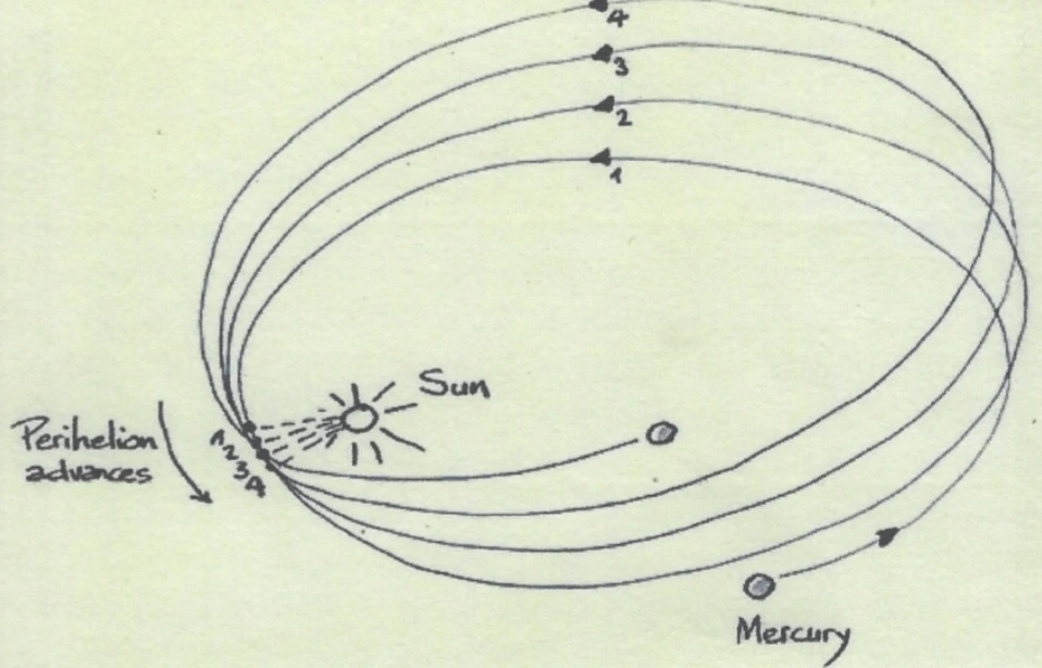 뉴턴역학으로는 설명이 안되어 아인슈타인의 일반 상대성 이론이 성립되는데 결정적인 근거가 되었던 '수성 근일점의 세차 운동'을 도식적으로 표현한 것