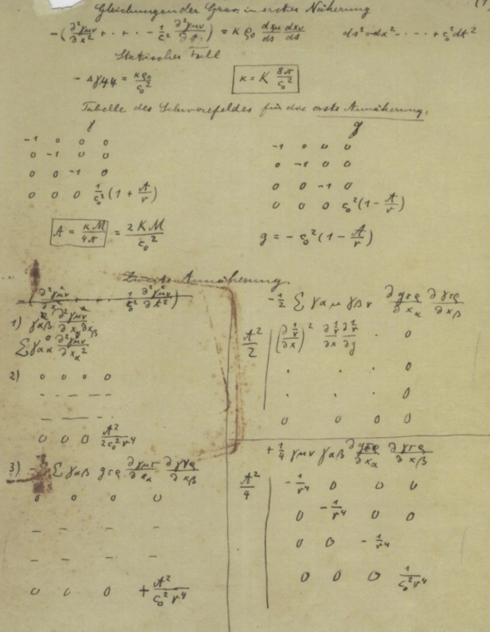 아인슈타인의 손글씨로 된 아인슈타인-베소 원고의 첫 페이지. 아인슈타인은 여기서 태양의 중력장 이론 도출을 위한 계산 과정을 보여준다frontiersin.org