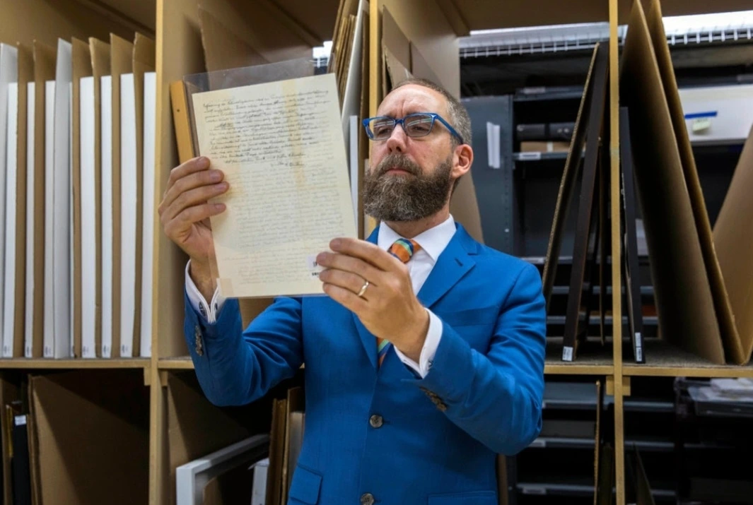 2018년, 4분간의 전화 입찰 공방 끝에 289만2,500달러에 팔린 아인슈타인의 “God letter"를 검사하는 크리스티 부사장 피터 클라넷The New York Times