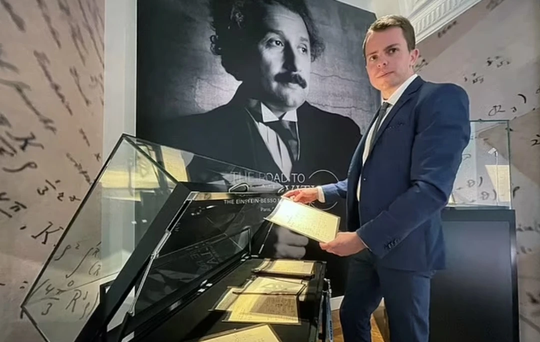Christie's의 도서 전문가 Vincent Belloy가 The Einstein-Besso manuscript를 보여주고 있다 Image: REUTERS