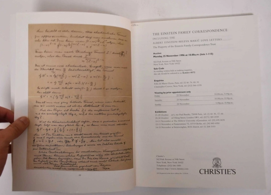 1996년 11월 25일, 첫 번째 아내 밀레바에게 보낸 편지를 포함하여 '한 천재의 밝은 면과 어두운 면을 모두 드러낸 알버트 아인슈타인의 아주 사적인 편지들'은 맨해튼의 크리스티 경매에서 총 878,500달러에 낙찰되게 되는데 이는 1913년과 1914년 아인슈타인이 가장 친한 친구이자 이탈리아-스위스 물리학자인 Michele Besso와 함께 그 유명한 '일반 상대성 이론을 발전시키는 과정을 보여주는 원고'이자 크리스티가 "일반상대성이론의 기원을 기록한 단 두 권의 원고 중 하나로서 아인슈타인의 작업에 대한 놀라운 기록이며 20세기 가장 위대한 과학자의 마음에 대한 매혹적인 통찰력을 제공한다"고 평가하는 가운데 결국 샌프란시스코 딜러인 Jeremy Norman에게 낙찰 되었던 '일반 상대성 이론' 원고의 낙찰 금액인 398,500달러의 두 배가 넘는 가격이었다.