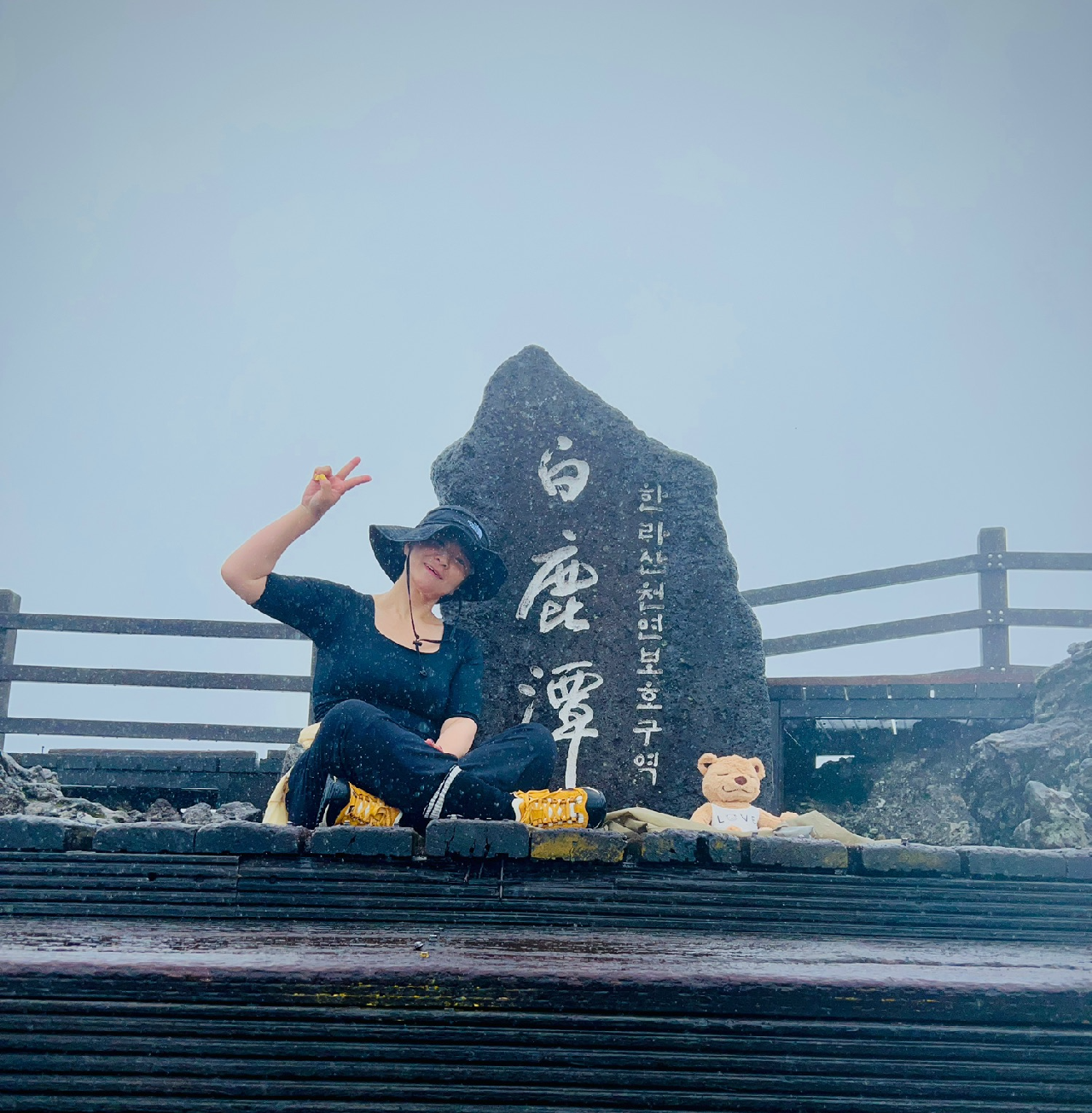 한라산 정상석 옆에서 찍은 셀카,