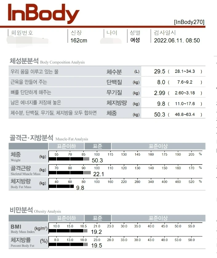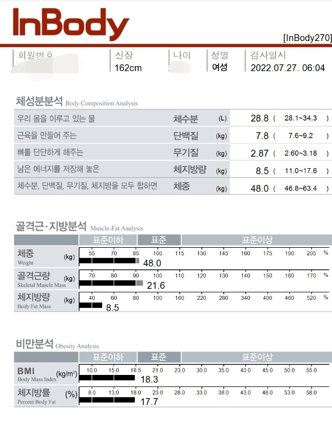 그리고 두 번째, 강박적으로 '체중변화'에만 초점이 맞춰줬던 게 '근량&체지방량&눈바디'로 옮겨가게 됨. 무슨 소리냐면 같은 50kg라도 체지방량이 30%일 때와 15%일 때는 몸 라인이나 탄탄함의 정도가 아예 다르다. 그리고 체지방을 줄이는 건 쉬우나, 근량 키우기는 진짜 겁나 어렵다는 게 체감이 됨..