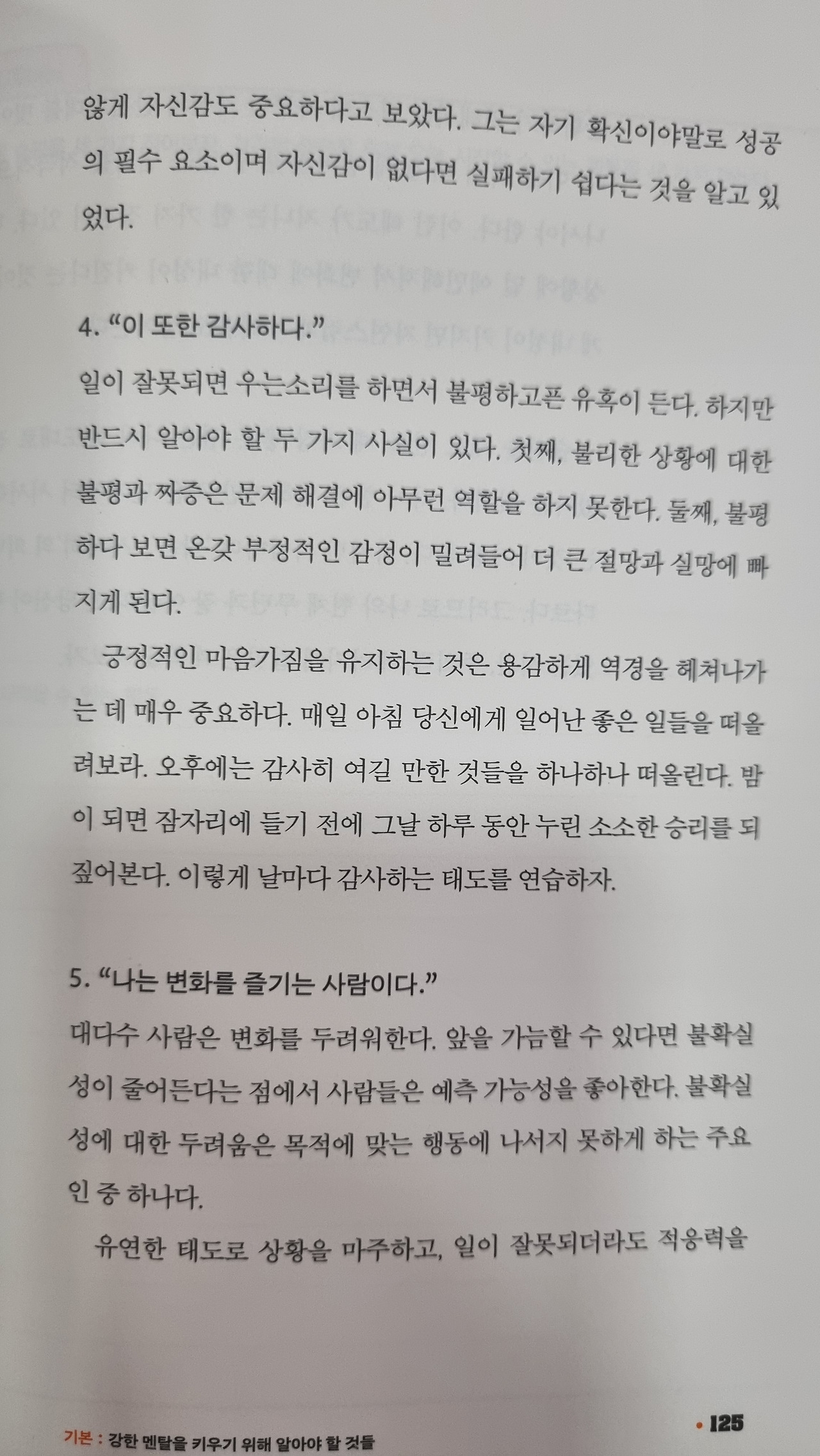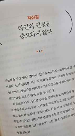 스스로 객관화할 줄 알아야 한다. 그래야 타인이 휘두르고 띄워주는 말에서 흔들리지 않고 중심을 지킬 수 있다. 그렇다고 남들 말은 전혀 듣지 않는 외골수가 되라는 말은 아니다. 자칫 쓰게 들릴 수도 있는 나를 위한 피드백이나 사랑스러운 말들은 놓치지 말고 수용하고 감사해야 한다. 이 생각들 또한 강한 멘탈을 가지기 위한 훈련인 것을 잊지 말 것!