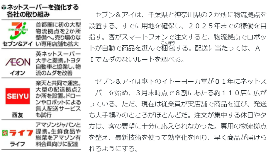 그렇다고 해서 아예 일본시장에 퀵커머스 플레이어들이 없다는 말은 아니다. 오히려 현재 이 시장에 단독 플레이어가 없다는걸 모두가 알기 때문에 승기를 잡기 위해 본격적으로 모두가 뛰어들고 있는 느낌이다. ╭( •̀ •́ )╮최근 야후마트도 "최단 15분만에 도착.."을 내세우며 전용 어플 제공까지 내세우고 있고, 그 외 에도 일본에 대표적인 슈퍼마켓들인 이온,세이유,라이프 등도 물류 센터 확장까지 하며 오프라인 강자로만 남아있는 것이 아닌 퀵커머스 시장에 뛰어 들었다.