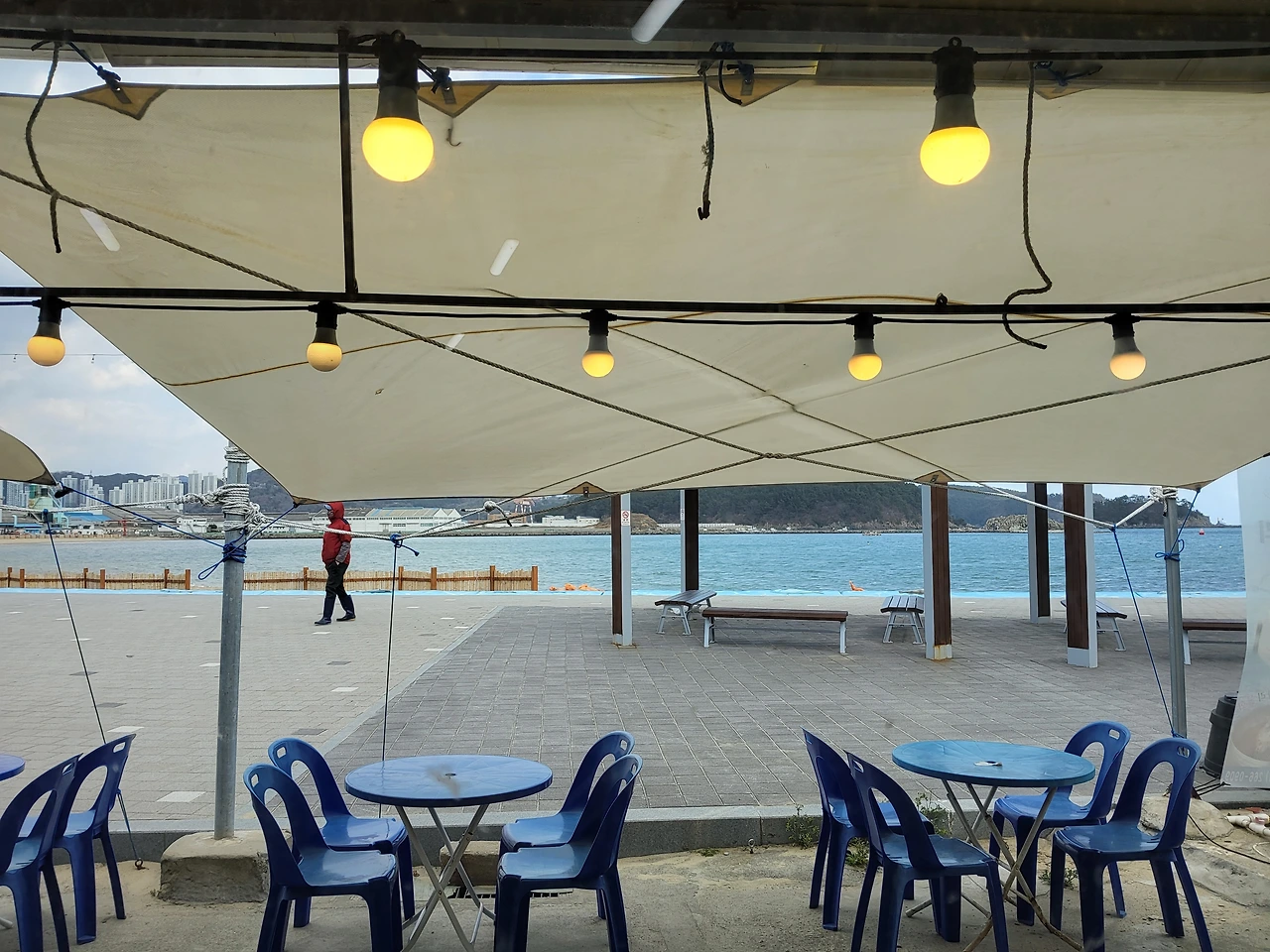 바닷가 날씨는 왔다리 갔다리다. 어린아이처럼. 잔잔한 파도는 어루만지듯 소리를 내면서 다독이고 있다. 무심코 지나가는 한 사람. 멀리 바닷가 무언가를 바라보는 노중년 여성. 잠시 후 뒤에서 다가가는 노중년 남성. 같이는 있었지만 약간의 거리감이 느껴진다. 여러 노인분들이 공공근로 작업복을 휘두르고 등장하면서 원하는 빈 벤치에 자리를 잡는다. 오전 일과가 끝나기를 기다리는 수건 털기.