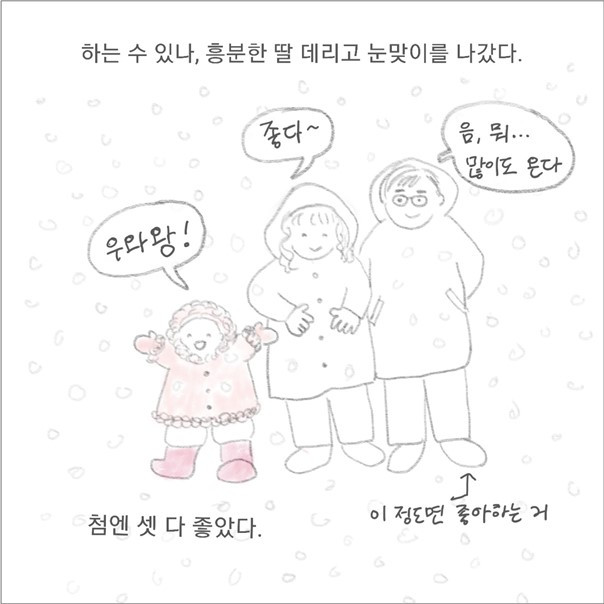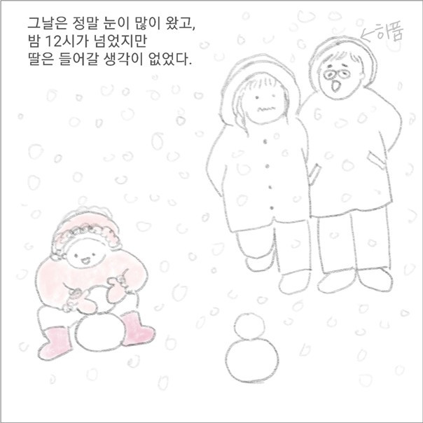 시간이 지나면서 점점 살이 빠져 홀쭉해지다 사라진 눈사람 얘기, 딸은 아직도 가끔 한다.
