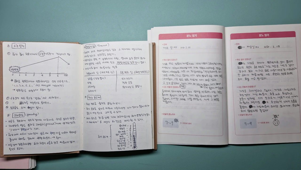2. 화가 난 날, 하루일들 돌아보며 얼마큼, 어떻게화가 났는지에 대해 노트에 쓰기.
