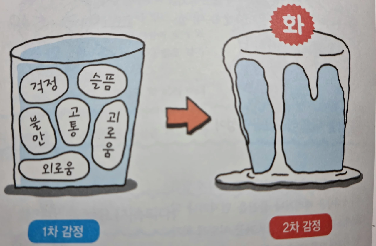 1차 감정들이 차곡차곡 쌓이고 그 감정이 다 차오르는 순간 2차 감정인 화가 각성한다고 이미지를 그린다.