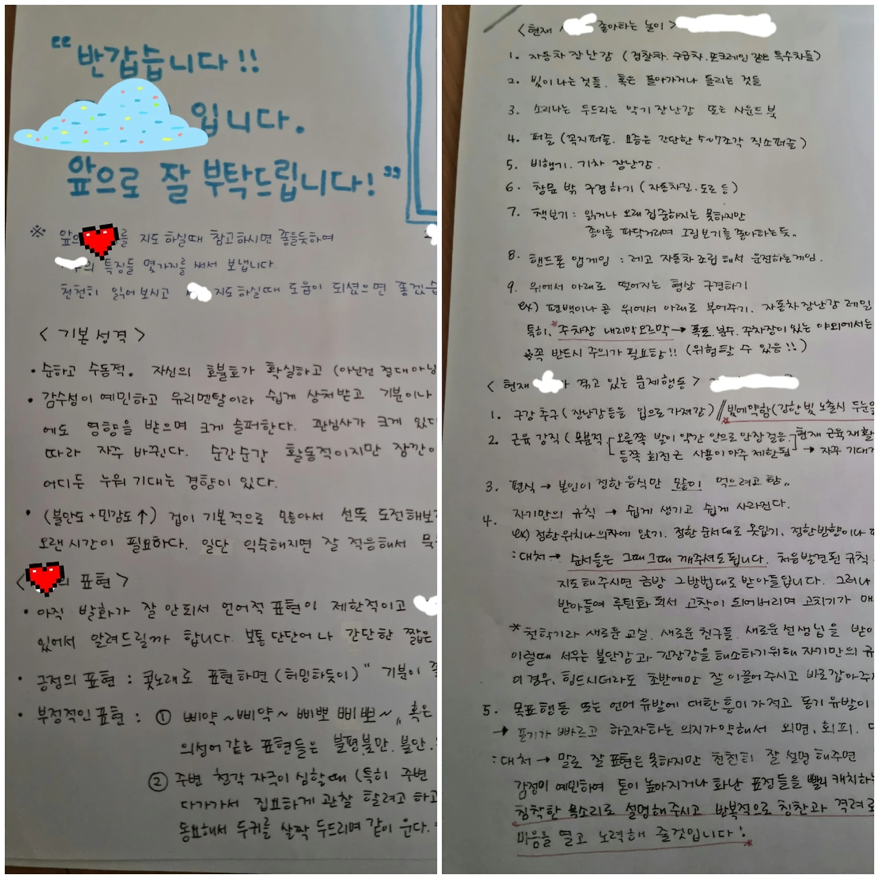 그러므로 특수교육 지식이 없을 수도 있는 담임선생님께 진우의 설명서(!)가 필요하다고 생각했다. 진우는 아직 말이 원활하지 못해서 자기를 표현하지도 못하고 글도 못 쓴다. 그래서 이해를 돕는 자료가 있으면 도움이 되시지 않을까. 또한 진우의 돌발행동에 당황하지 않고 대처해주시지 않을까 하는 마음으로 썼다.