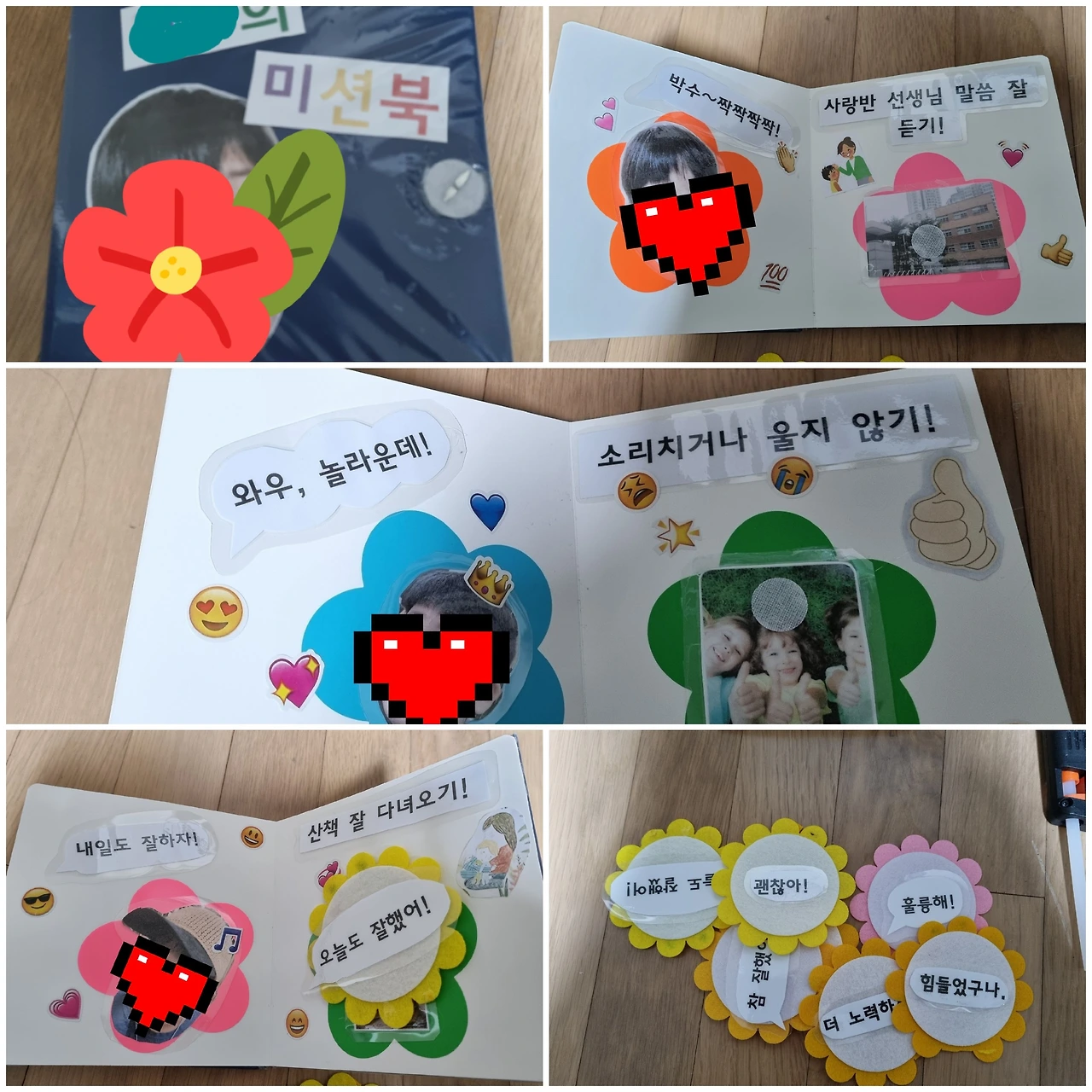 그래서 선생님들께 검사 도장 같은 것을 받아오면 어떨까 하는 생각에 만들었다. 일종의 칭찬스티커 북인데, 미션북에 평가 스티커를 받을 때마다 선생님께 조금의 관심과 말이라도 한마디 들을 수 있겠다 싶었다. 물론 안 좋은 날도 있다. 안 좋으면 안 좋은 대로 그날 학교생활을 나도 어렴풋이 확인도 돼서 좋았다.